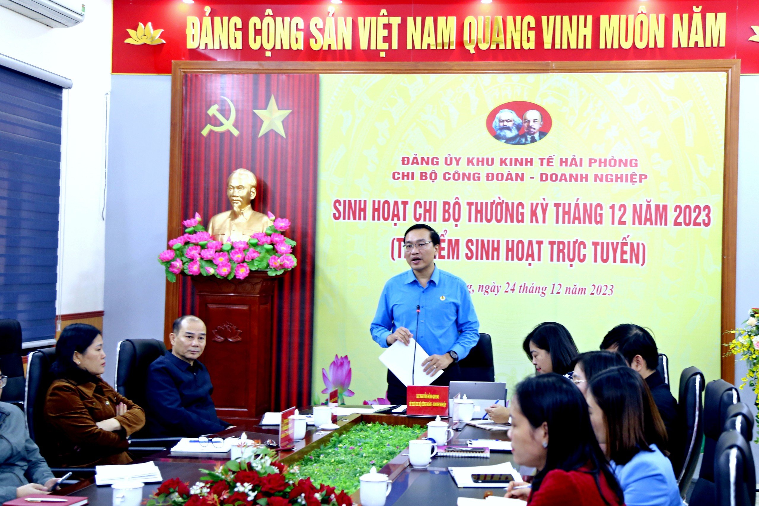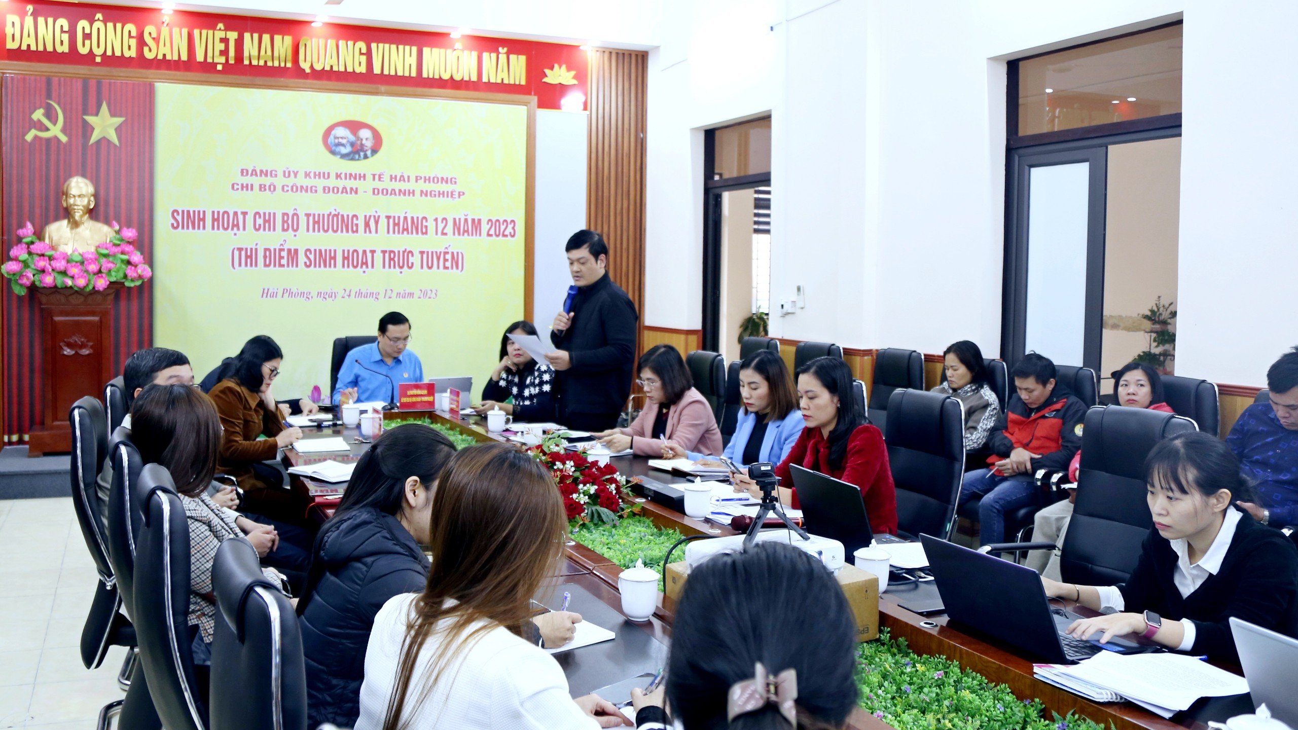 Thực hiện Hướng dẫn số 03-HD/TW ngày 27/12/2022 của Ban Bí thư Trung ương Đảng về thí điểm sinh hoạt đảng trực tuyến ở đảng bộ cơ sở, chi bộ có tính chất đặc thù hoặc trong hoàn cảnh đặc biệt và sinh hoạt đảng theo tổ đảng ở chi bộ đông đảng viên; Hướng dẫn số 08 HD/ĐU của Đảng ủy Khu Kinh tế ngày 26/10/2023 về việc thí điểm sinh hoạt đảng trực tuyến tại Chi bộ Công đoàn – Doanh nghiệp Khu Kinh tế Hải Phòng, ngày 24/12, Chi bộ Công đoàn Doanh nghiệp tổ chức sinh hoạt chi bộ thường kỳ tháng 12, thí điểm dưới hình thức sinh hoạt trực tuyến với sự tham gia của 70 Đảng viên đang sinh hoạt tại chi bộ.