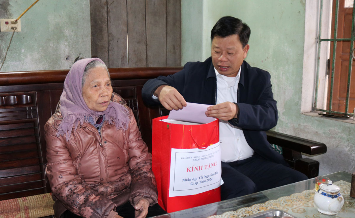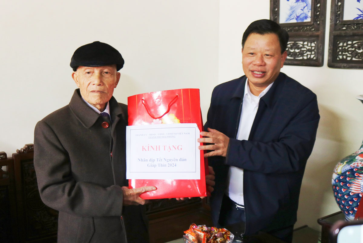 Thăm, tặng quà, chúc Tết bà Đặng Thị Hón, sinh năm 1946, hộ nghèo ở thôn Câu Hạ A, xã Quang Trung, đồng chí Trưởng Ban Quản lý Khu kinh tế Hải Phòng chia sẻ khó khăn với gia đình, đề nghị chính quyền địa phương tiếp tục tạo điều kiện giúp đỡ gia đình bà có cuộc sống ổn định hơn; đồng thời đề nghị huyện xem xét hỗ trợ gia đình bà xây, sửa nhà đã cũ và xuống cấp.