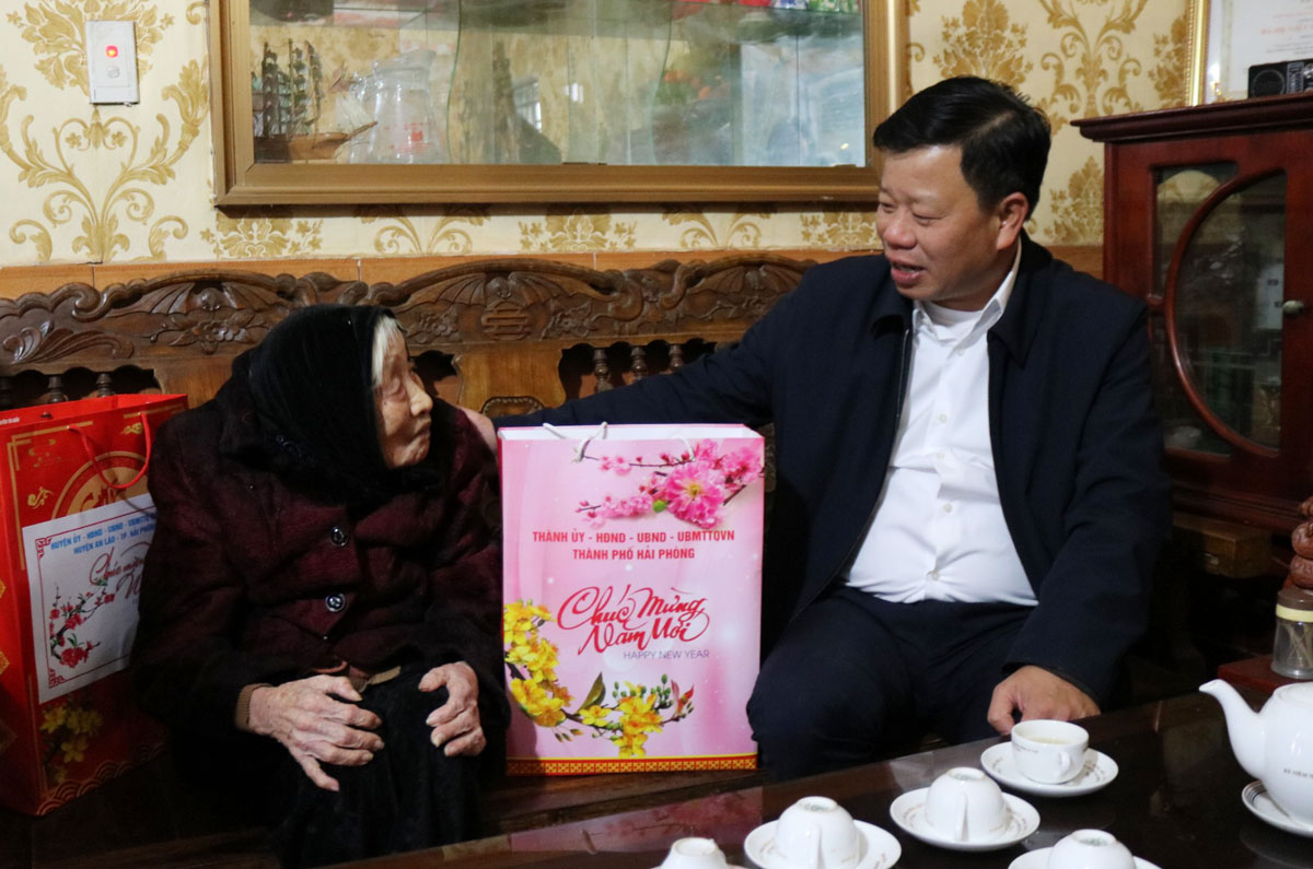 Đồng chí Trưởng Ban Quản lý Khu kinh tế Hải Phòng đến thăm, tặng quà Mẹ Việt Nam Anh hùng Nguyễn Thị Nuôi ở thôn Quyết Tiến 3, xã An Thắng và Mẹ Việt Nam Anh hùng Trần Thị Chuốt ở thôn Cẩm Văn, xã Quốc Tuấn. Đồng chí chúc các Mẹ Việt Nam Anh hùng luôn vui khỏe, sum vầy bên con cháu, vui Tết đón Xuân đầm ấm bên gia đình.