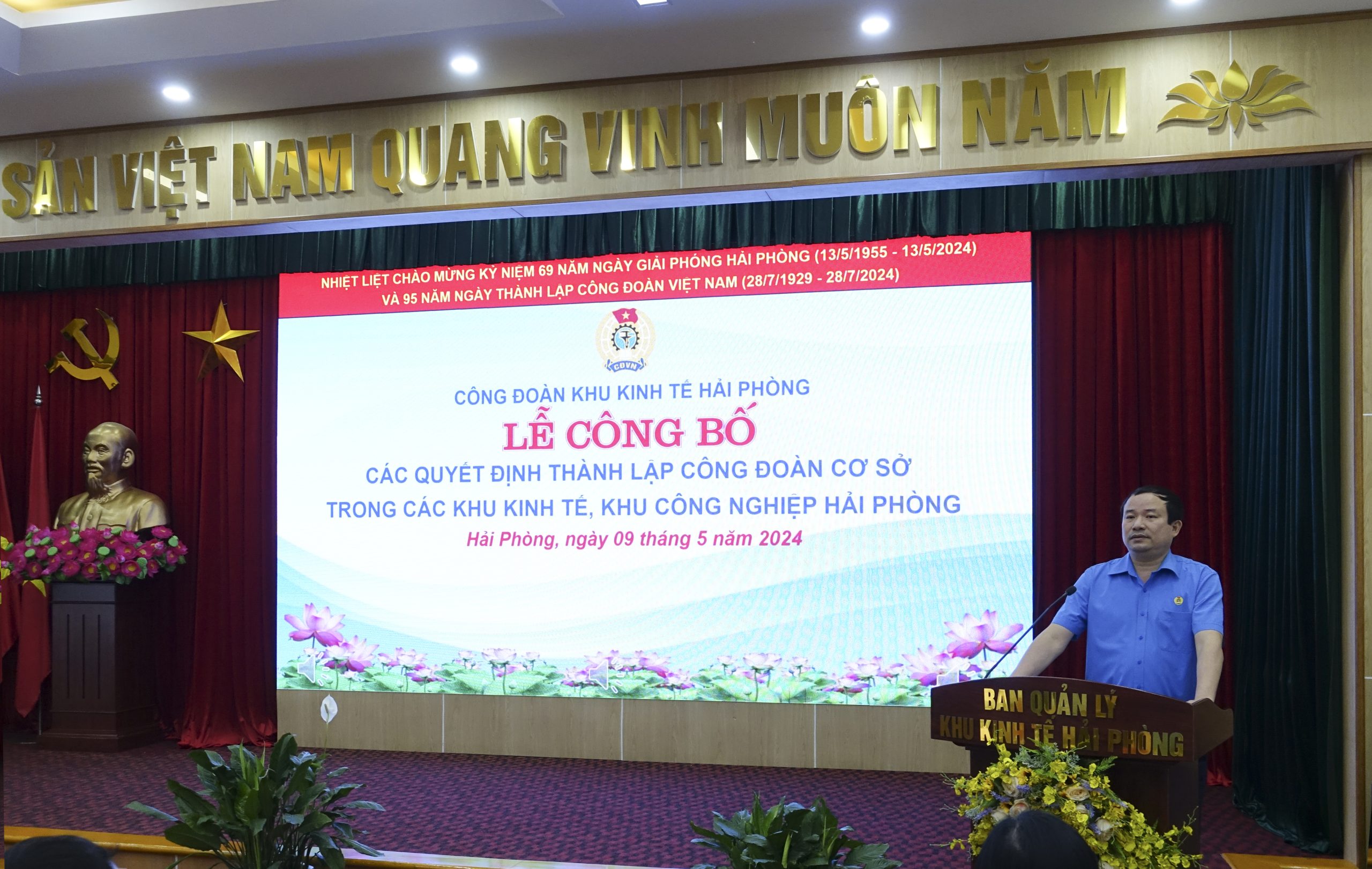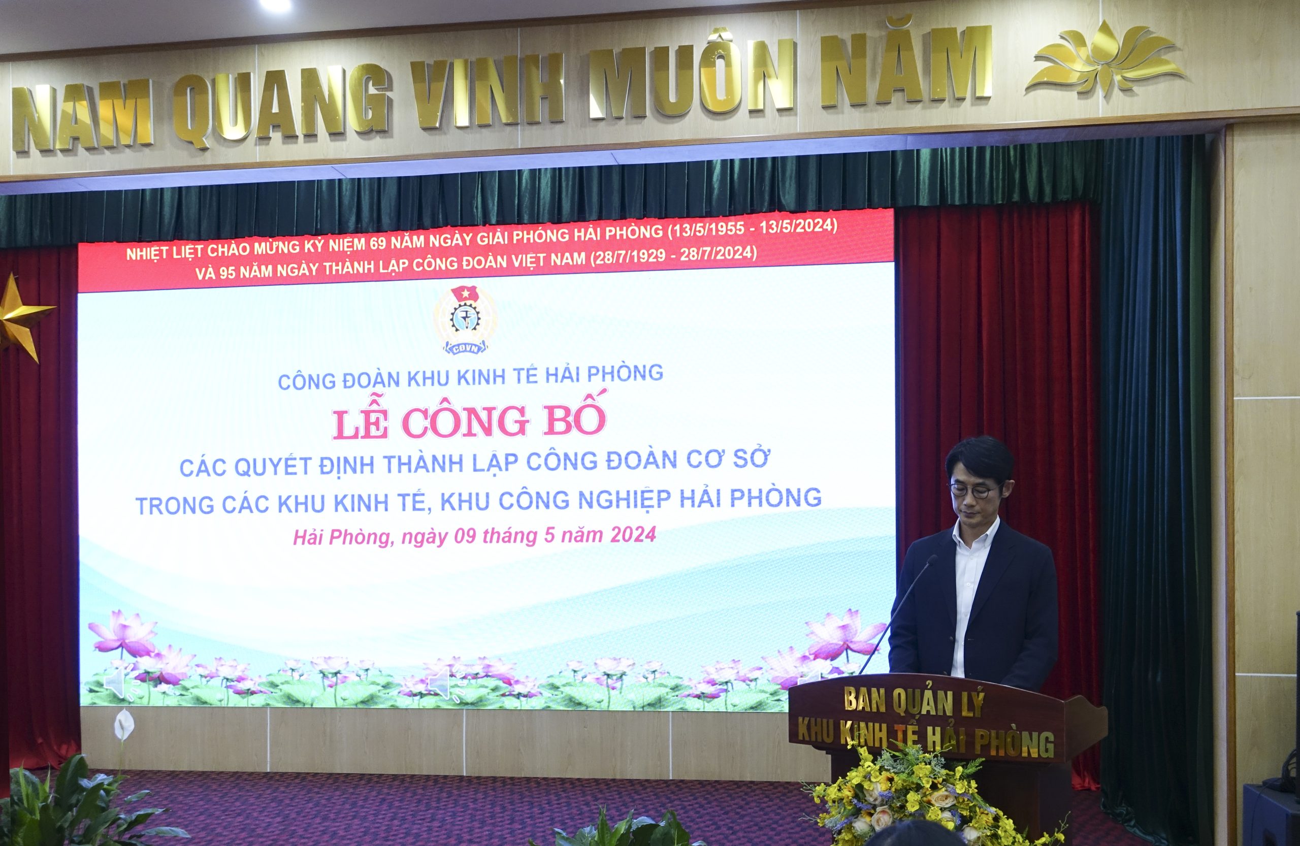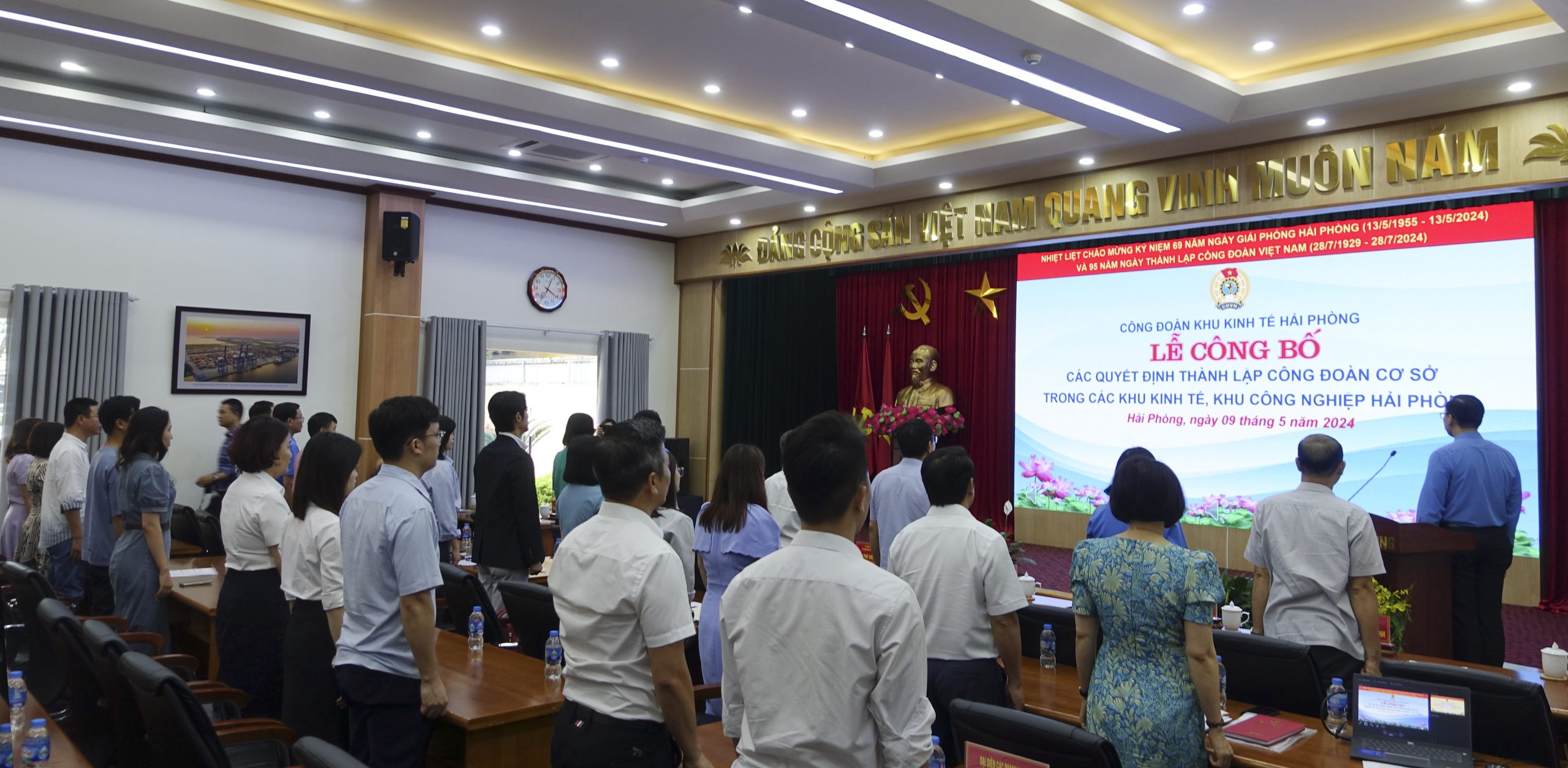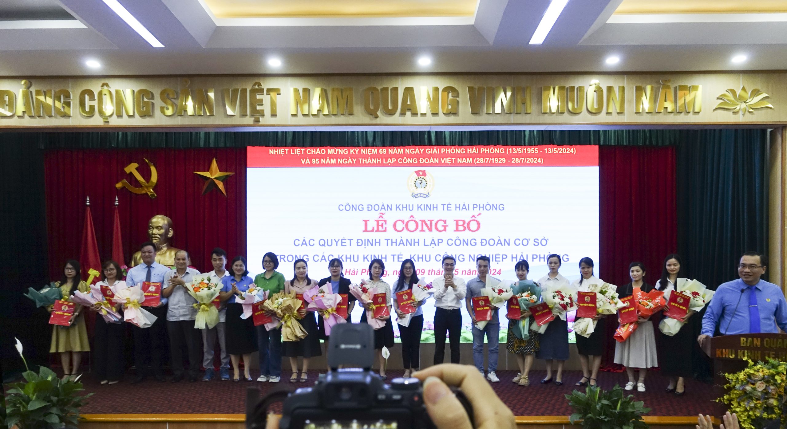 Chiều 09/5/2024 Ban Quản lý Khu kinh tế Hải Phòng và Công đoàn Khu kinh tế phối hợp tổ chức Hội nghị “Công bố các quyết định thành lập tổ chức công đoàn cơ sở tại các doanh nghiệp trong Khu công nghiệp, Khu kinh tế trên địa bàn thành phố Hải Phòng”.
