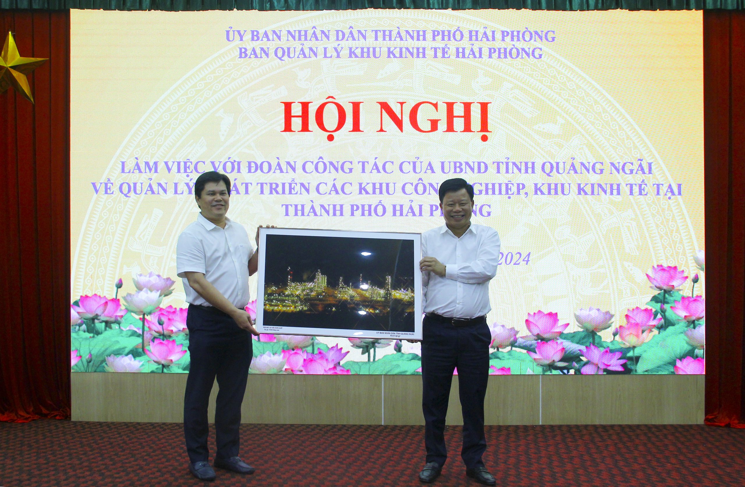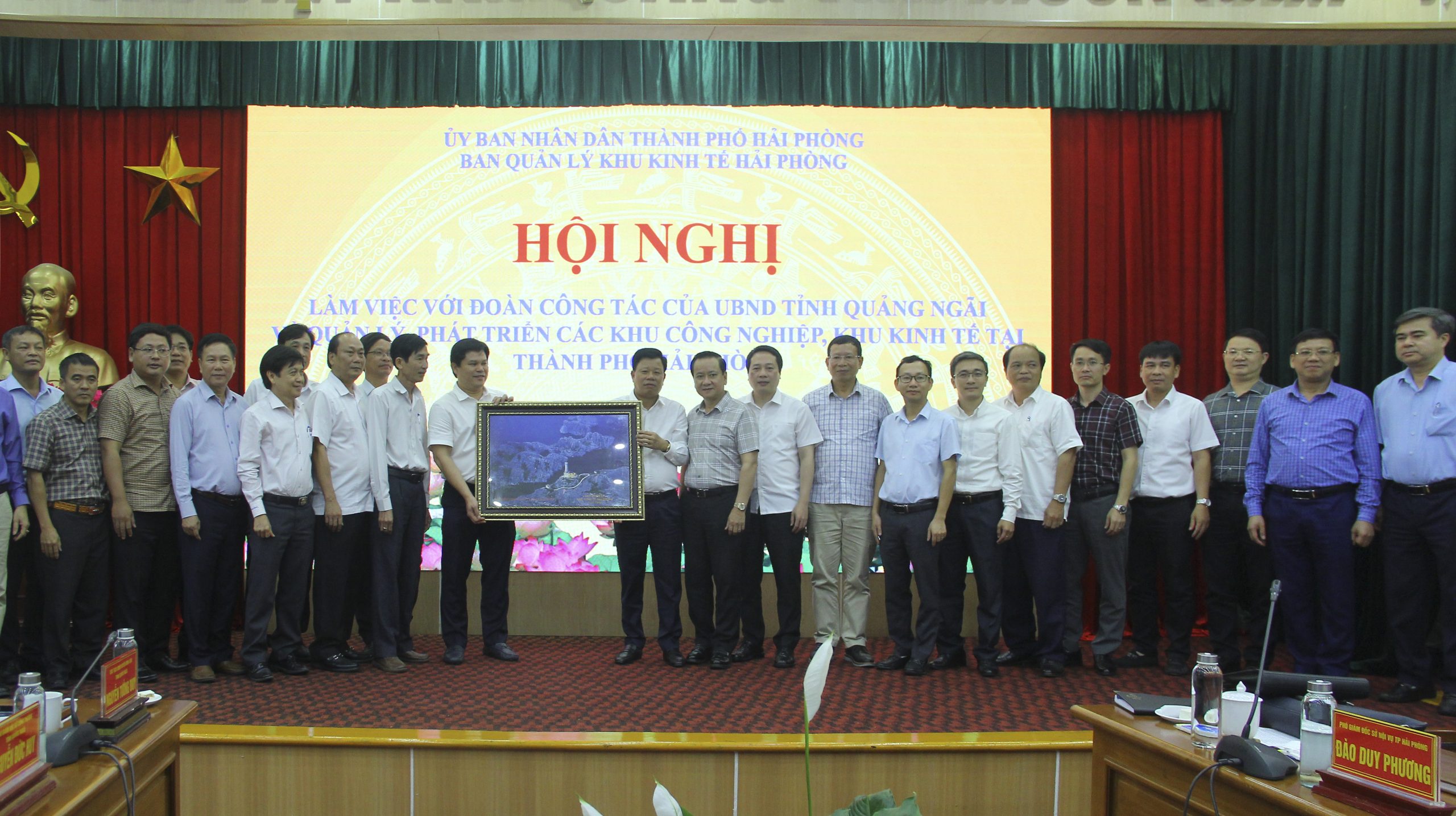 Trưởng Ban Quản lý Khu kinh tế Hải Phòng Lê Trung Kiên chào mừng Đoàn công tác của UBND tỉnh Quảng Ngãi đã đến thăm, khảo sát và trao đổi kinh nghiệm tại thành phố Hải Phòng. Đồng chí thông tin một số nét về tình hình phát triển kinh tế – xã hội thành phố, cũng như tình hình thu hút đầu tư tại Khu kinh tế, Khu công nghiệp trong thời gian qua của Hải Phòng.Trưởng Ban Quản lý Khu kinh tế Hải Phòng thông tin thêm, với những thành công của Khu kinh tế Đình Vũ – Cát Hải và yêu cầu của Trung ương về phát triển thành phố, dự kiến thành phố sẽ thành lập thêm một khu kinh tế ven biển mới, nối liền dải các khu kinh tế ven biển tại vùng duyên hải Bắc Bộ (Vân Đồn, Quảng Yên, Đình Vũ – Cát Hải, Nam Hải Phòng, Thái Bình, Ninh Cơ…), khai thác hiệu quả các dự án hạ tầng quan trọng như: Cao tốc ven biển Ninh Bình – Hải Phòng; Cảng cửa ngõ quốc tế kết hợp trung chuyển quốc tế Nam Đồ Sơn; Sân bay quốc tế Tiên Lãng dự bị cho sân bay Nội Bài; đường sắt cao tốc Lào Cai – Hà Nội – Hải Phòng; đường sắt ven biển… Đây sẽ là khu kinh tế thế hệ mới, phát triển theo mô hình sinh thái, bền vững, sử dụng hiệu quả, tiết kiệm năng lượng, tài nguyên, giảm thiểu phát thải carbon; thu hút các ngành công nghiệp công nghệ cao, công nghiệp chế biến, chế tạo có giá trị gia tăng cao, tham gia sâu vào chuỗi cung ứng và chuỗi giá trị toàn cầu. Hiện thành phố đã hoàn thành Đề án, trình Thủ tướng Chính phủ và đang được các Bộ, ngành Trung ương nghiên cứu, thẩm định. Đồng chí khẳng định, Ban Quản lý Khu kinh tế Hải Phòng nói riêng, thành phố nói chung sẵn lòng chia sẻ và tích cực hỗ trợ, tạo mọi điều kiện thuận lợi để tỉnh Quảng Ngãi tìm hiểu, tham khảo kinh nghiệm trong lĩnh vực quản lý, đầu tư phát triển Khu kinh tế Hải Phòng.