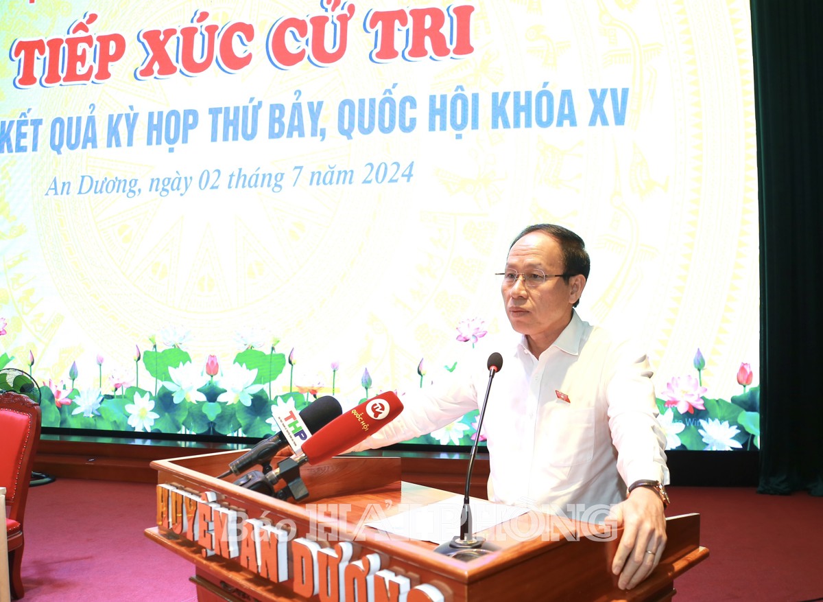 Trân trọng cảm ơn những ý kiến tâm huyết, trách nhiệm của cử tri huyện An Dương, đồng chí Phó thủ tướng Trần Lưu Quang thông báo tóm tắt về kết quả phát triển kinh tế-xã hội, bảo đảm quốc phòng-an ninh của đất nước trong 6 tháng vừa qua, những khó khăn, trăn trở của lãnh đạo Đảng, Nhà nước, Chính phủ đối với sự phát triển của đất nước. Đồng thời, đánh giá cao những kết quả của thành phố, huyện An Dương đạt được, trong đó nhấn mạnh những thuận lợi, khó khăn khi huyện An Dương trở thành đơn vị hành chính cấp quận. Đồng chí Phó thủ tướng đề nghị thành phố tập trung một số giải pháp phát triển kinh tế-xã hội như: ban hành các cơ chế, chính sách hỗ trợ doanh nghiệp, nhất là các doanh nghiệp vừa và nhỏ; tập trung công tác chuyển đổi số; xây dựng Hải Phòng trở thành thành phố “nói không với ma túy”… Cùng với đó, đồng chí mong muốn người dân đồng thuận, đoàn kết, chia sẻ với chính quyền thành phố trong triển khai thực hiện các giải pháp vì sự phát triển chung của Hải Phòng.