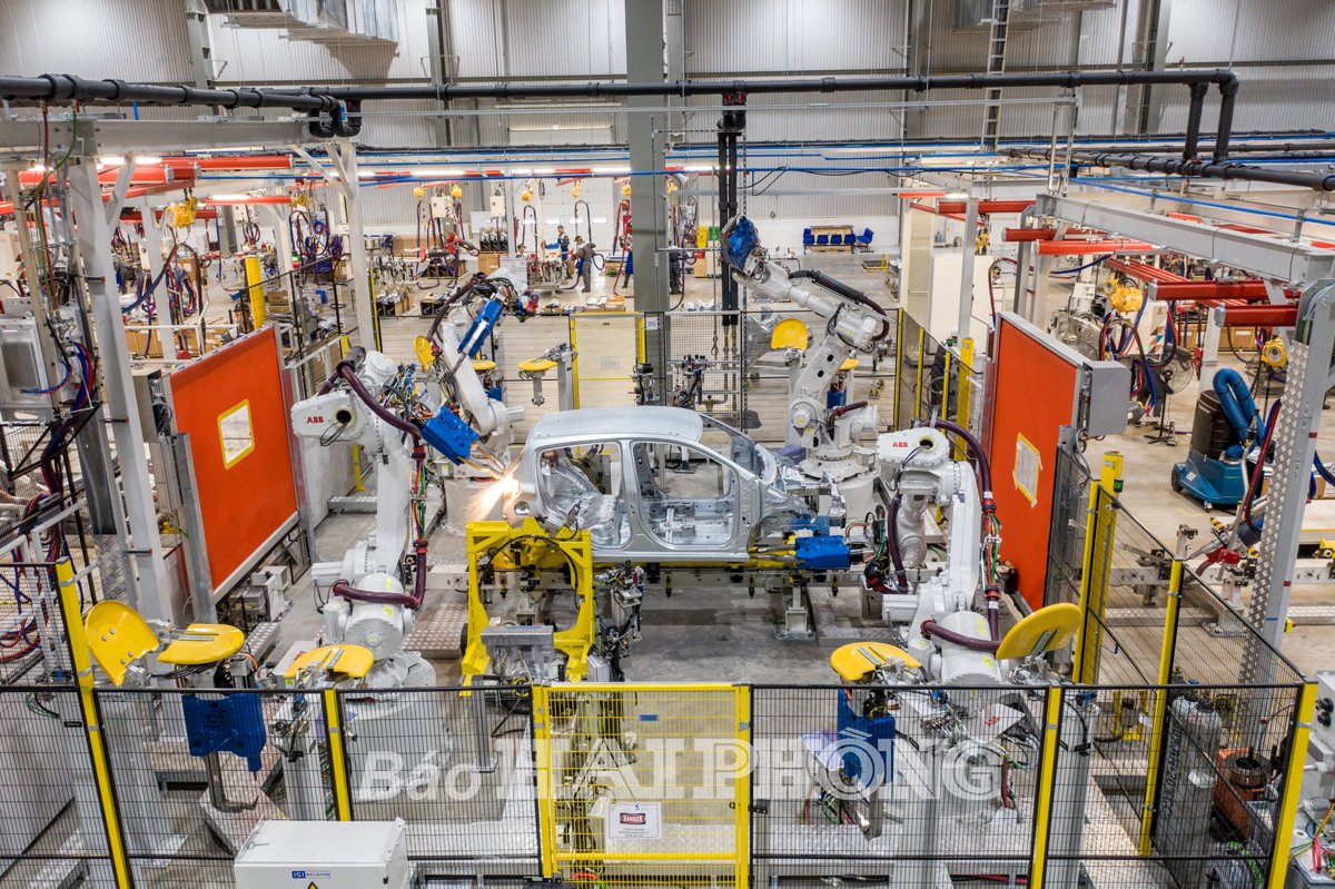 Xe ô tô điện được sản xuất trên dây chuyền tự động hoá cao với công nghệ hàng đầu thế giới tại Nhà máy ô tô VinFast Hải Phòng (Khu kinh tế Đình Vũ – Cát Hải).