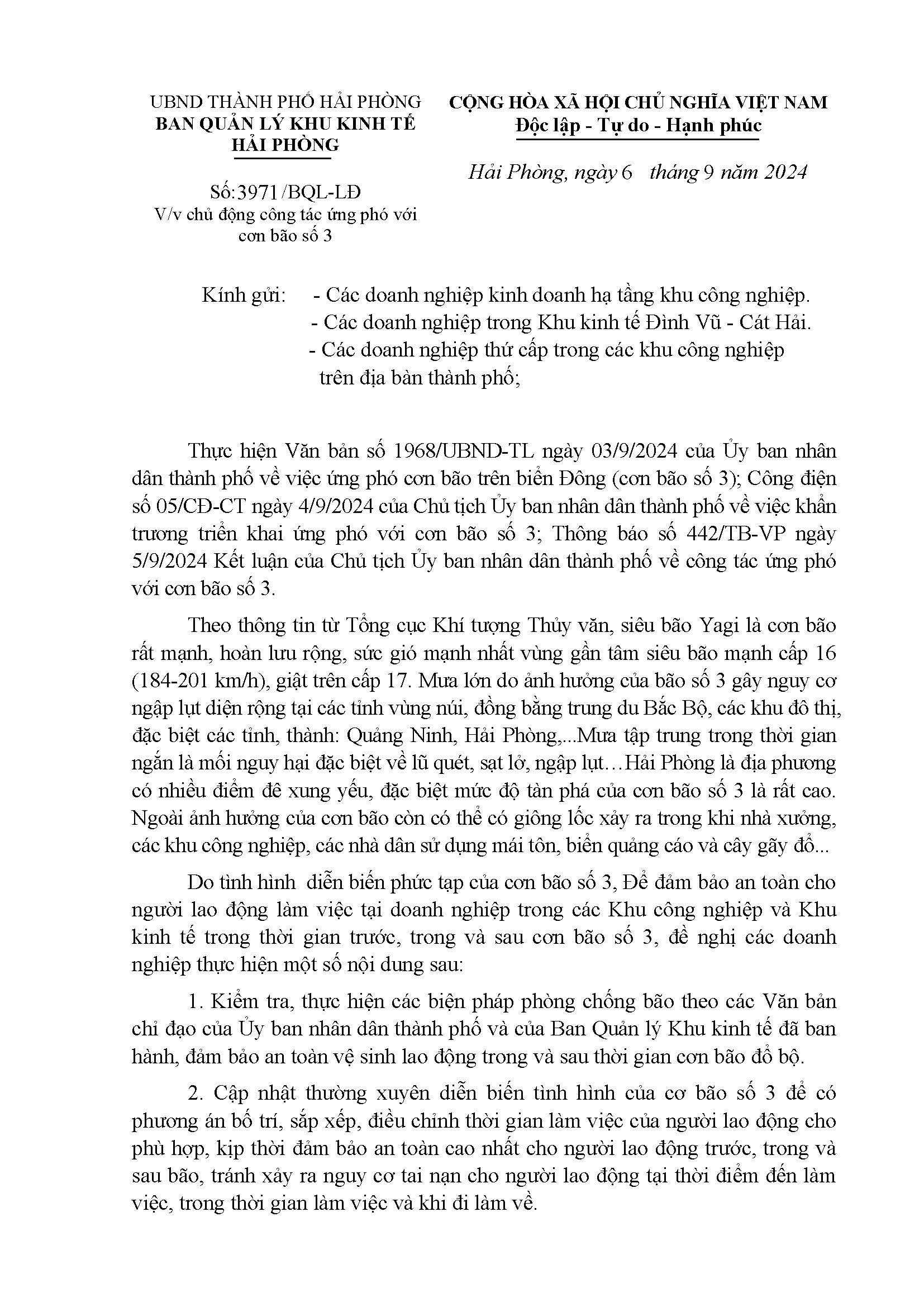 VB 3971 – ngày 6/9/2024 – Đảm bảo an toàn cho người lao động với bão số 3