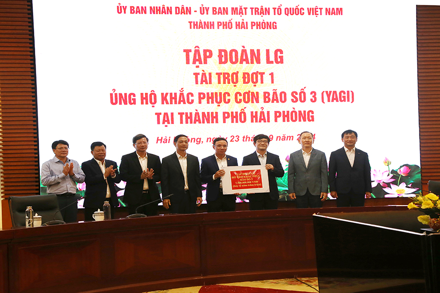 Chiều 23/9, tại Trung tâm Hội nghị thành phố, Tập đoàn LG do Tổng Giám đốc LG Display, Choi In Kwan cùng Tổng Giám đốc LG Electronies, Baek Chan đến gặp mặt và trao tặng tài trợ Đợt 1 ủng hộ khắc phục cơn Bão số 3 (Yagi) tại thành phố Hải Phòng.