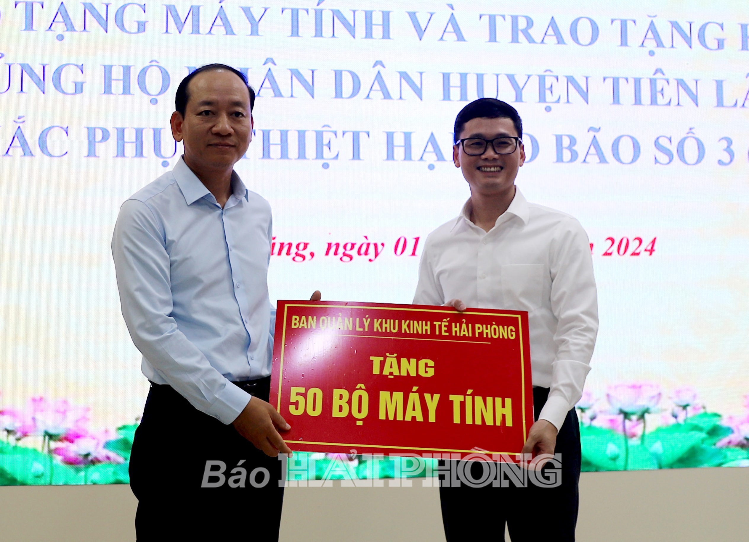 Đại diện lãnh đạo Ban Quản lý Khu Kinh tế Hải Phòng trao tặng UBND huyện Tiên Lãng 50 bộ máy tính.