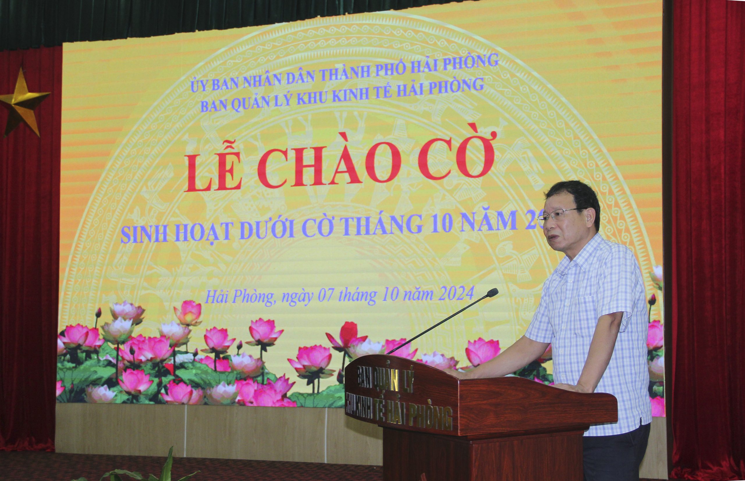 Thực hiện Thông tri số 19-TT/TU ngày 23/3/2018 của Thành ủy Hải Phòng về việc định kỳ tổ chức nghi thức Chào cờ Tổ quốc, hát Quốc ca và sinh hoạt dưới cờ, cũng như theo Kế hoạch số 756/KH-BQL ngày 03/4/2018 của Ban Quản lý Khu kinh tế Hải Phòng, vào sáng ngày 07/10/2024, Ban Quản lý Khu kinh tế Hải Phòng đã trang trọng tổ chức Lễ chào cờ và sinh hoạt dưới cờ tháng 10/2024.