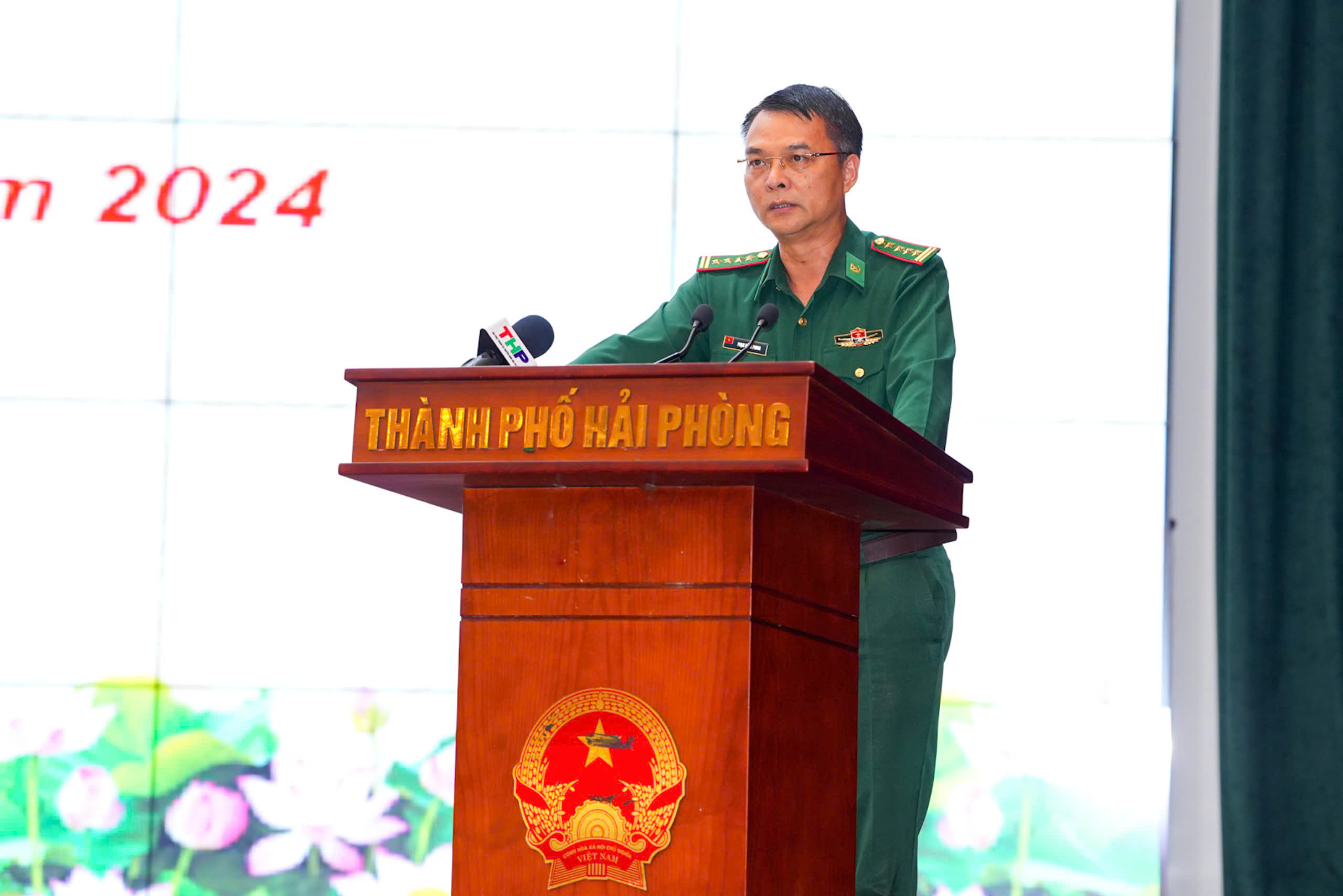 Đại tá Nguyễn Hồng Phong, Chính ủy Bộ đội Biên phòng Hải Phòng phát biểu tại Hội nghị.