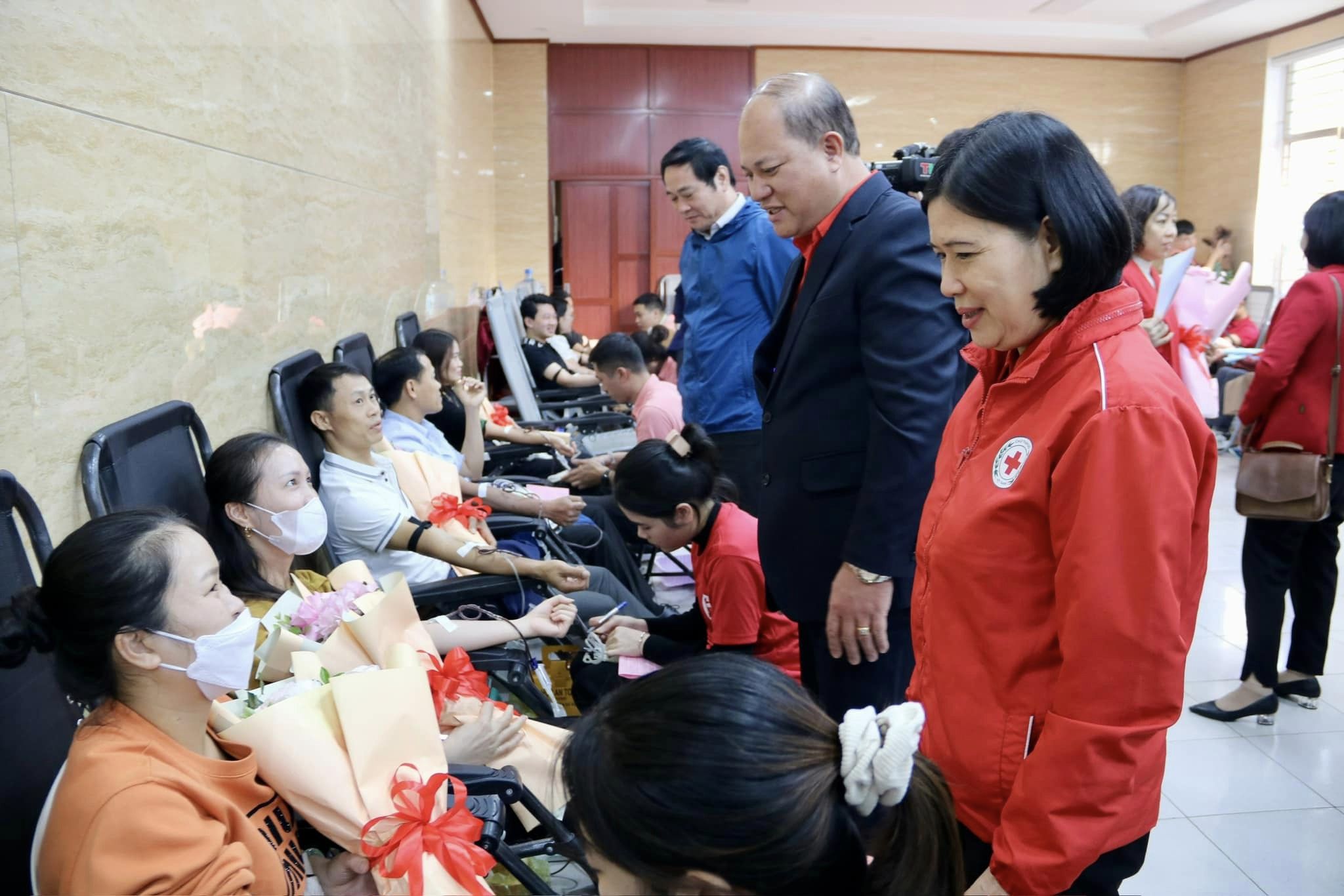 Lãnh đạo Hội Chữ thập đỏ thành phố tặng hoa độn viên người tham gia hiến máu