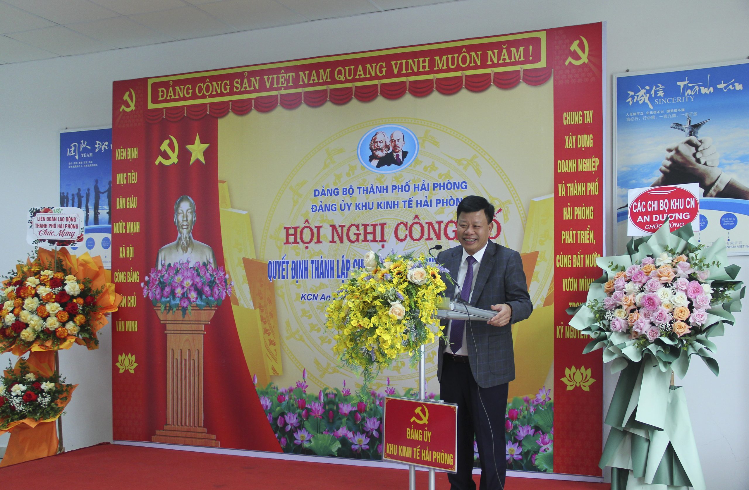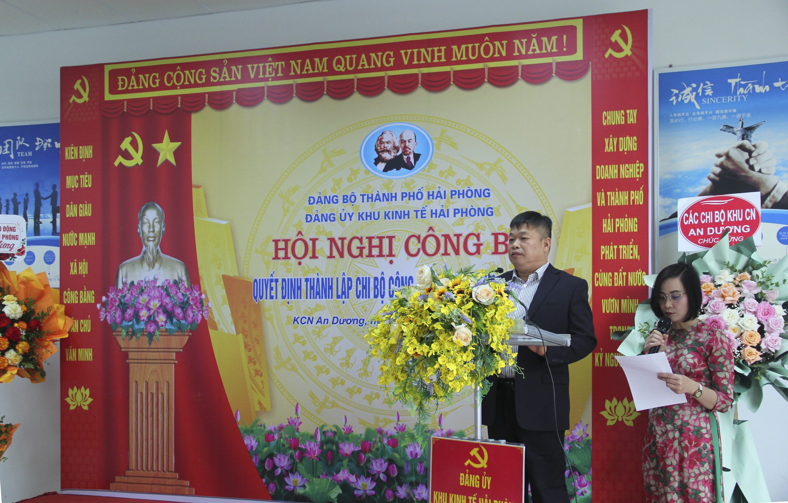 Đồng chí Đào Phú Thùy Dương, Ủy viên Thành ủy, Bí thư Đảng ủy KKT HP và đồng chí Lê Trung Kiên – Ủy viên Ban Thường vụ Thành ủy, Trưởng ban Ban Quản lý Khu kinh tế Hải Phòng trao quyết định Thành lập chi bộ và tặng hoa chúc mừng.