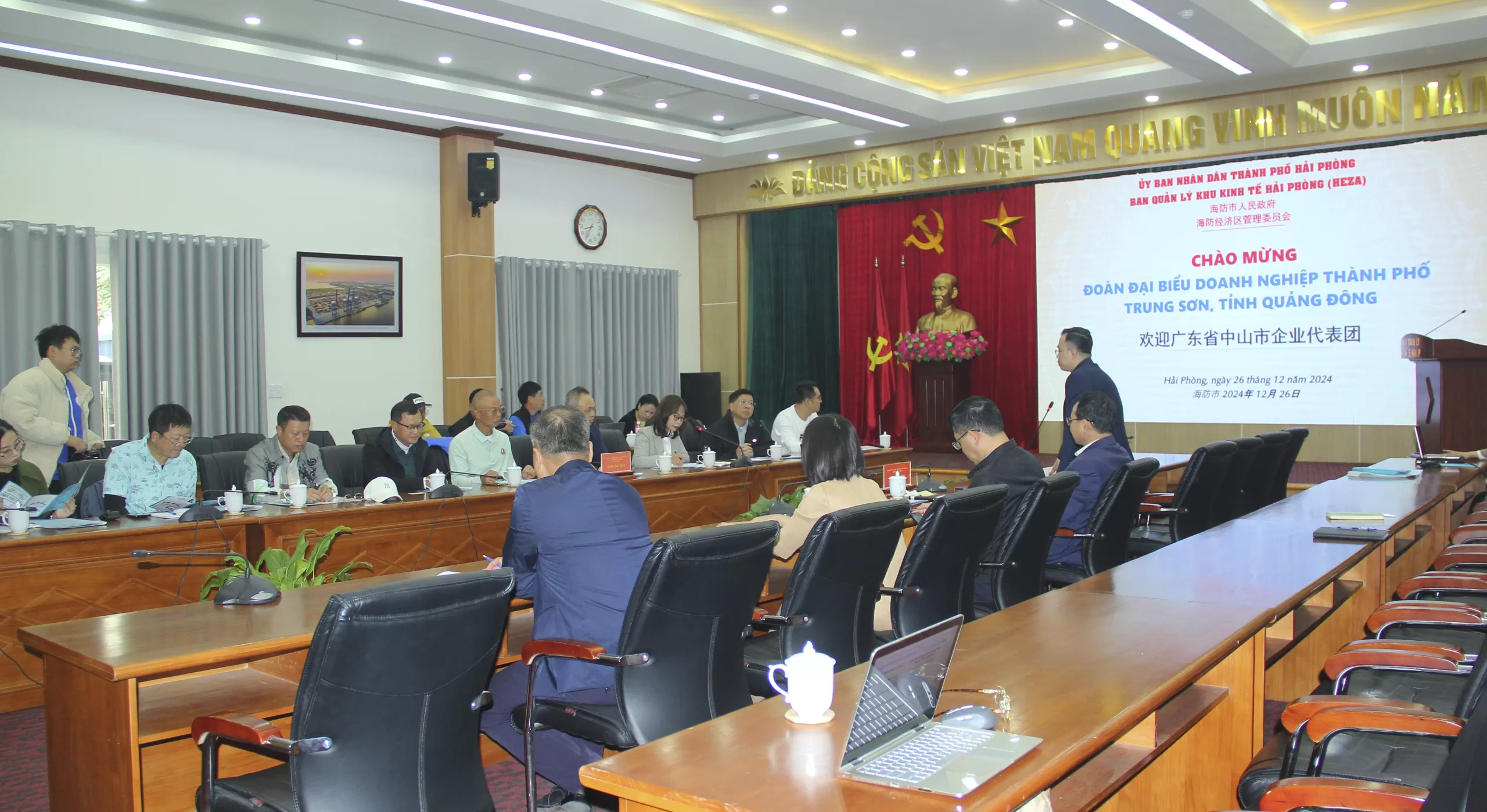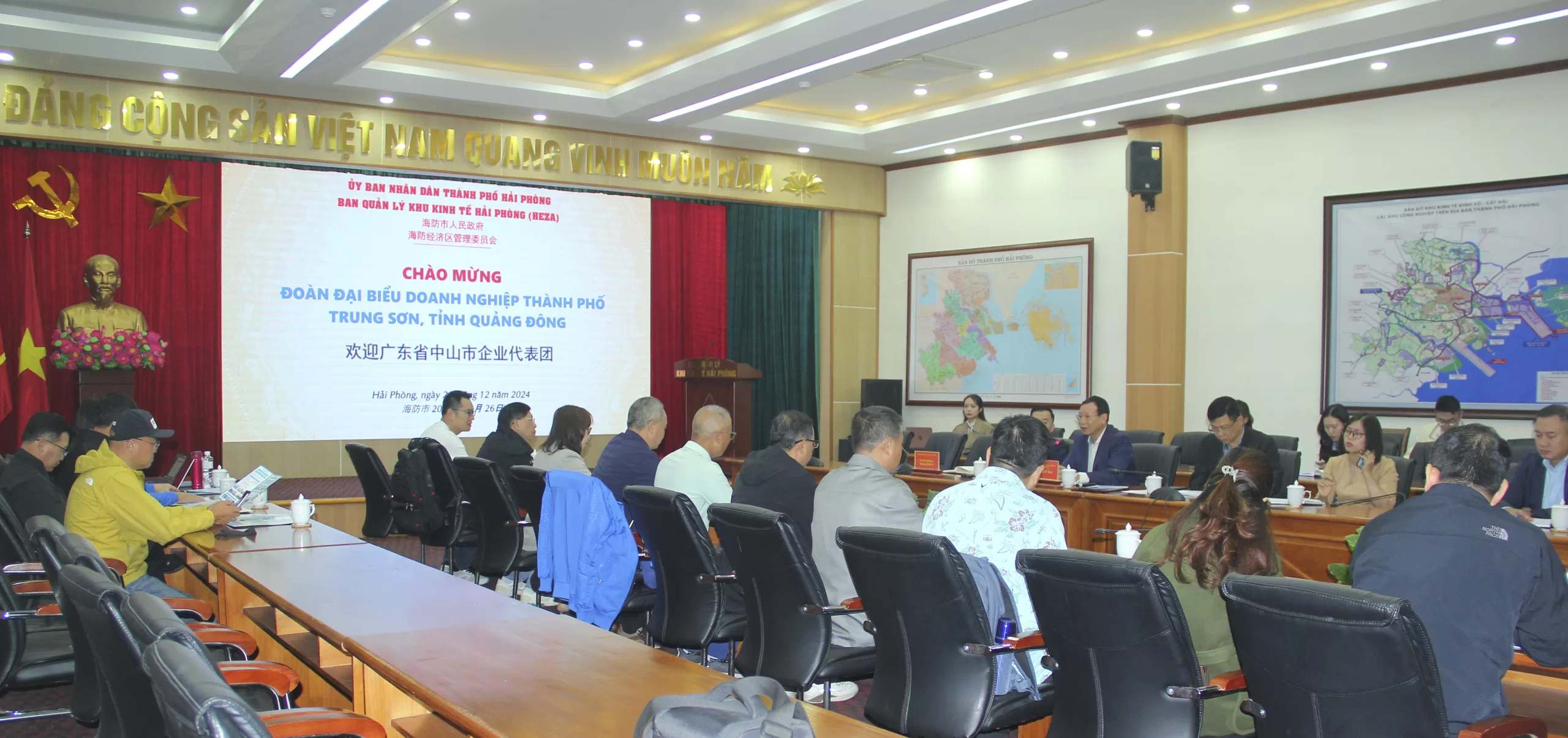 Sáng ngày 26/12/2024, Ban Quản lý Khu Kinh tế Hải Phòng đã tiếp đón đoàn đại biểu doanh nghiệp đến từ thành phố Trung Sơn, tỉnh Quảng Đông, Trung Quốc, do ông Đàm Thu Hoa, đại diện Công ty TNHH Dụng Cụ Thể Thao Lập Trình Trung Sơn, làm trưởng đoàn.