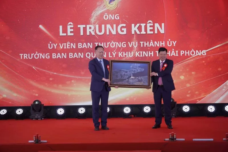 Đồng chí Lê Trung Kiên, Trưởng Ban Quản lý Khu Kinh tế Hải Phòng tặng quà lưu niệm cho Công ty TNHH Sản xuất Việt Nam hàn đặc biệt Pourin