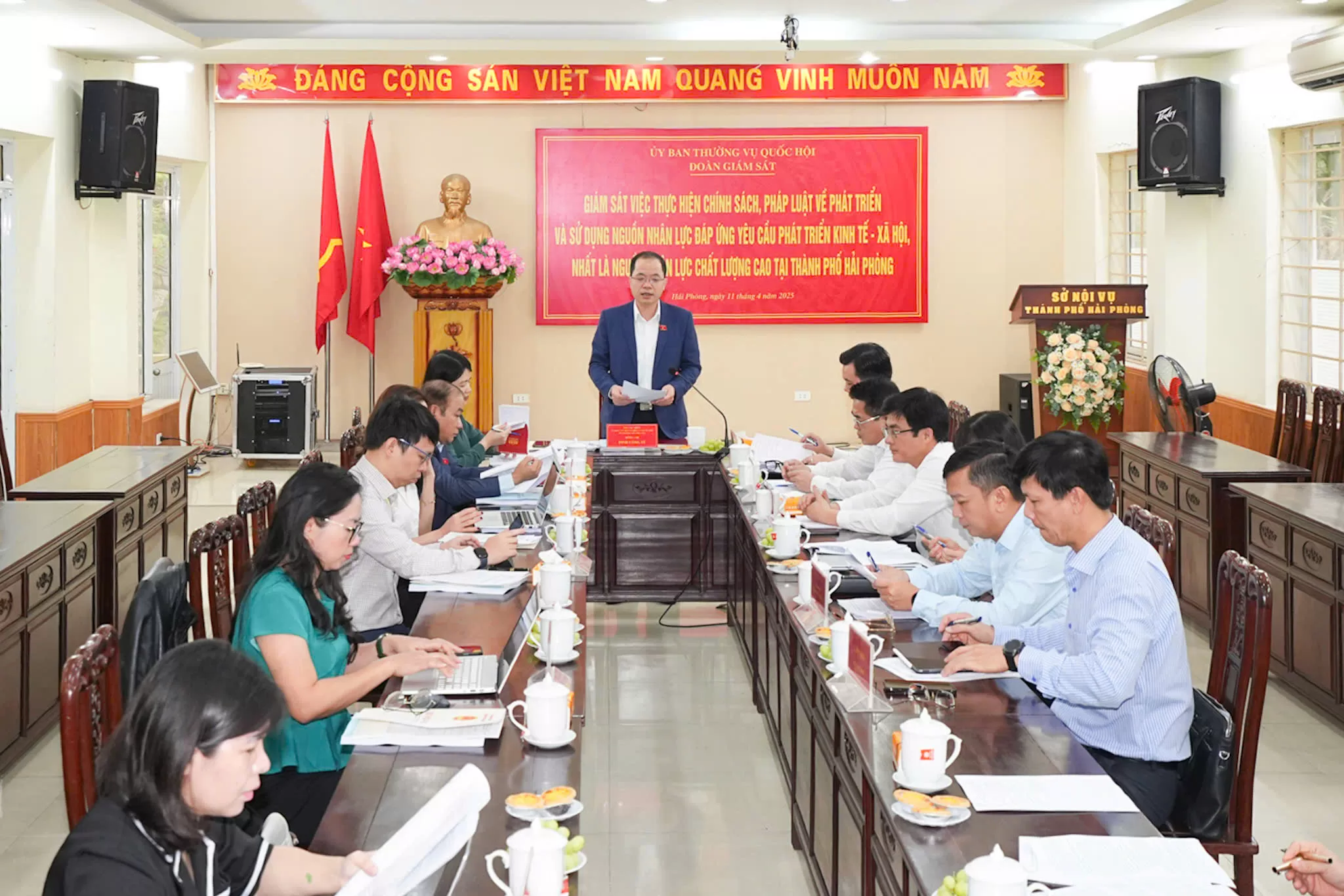 Phát biểu tại buổi làm việc với Đoàn giám sát, đại diện Ban Quản lý nhấn mạnh, trong thời gian tới, Hải Phòng sẽ tiếp tục thu hút đầu tư có chọn lọc vào các ngành nghề sử dụng công nghệ cao, thân thiện môi trường, từ đó tạo sức ép tích cực để nâng tầm nguồn nhân lực. Ban cũng đề nghị thành phố tiếp tục hoàn thiện cơ chế chính sách đặc thù hỗ trợ đào tạo nghề, mở rộng đối tượng thụ hưởng theo Nghị quyết 03/2024/NQ-HĐND, đồng thời kêu gọi thêm các doanh nghiệp lớn đầu tư trung tâm nghiên cứu, chuyển giao công nghệ để phát triển nhân lực chuyên sâu.