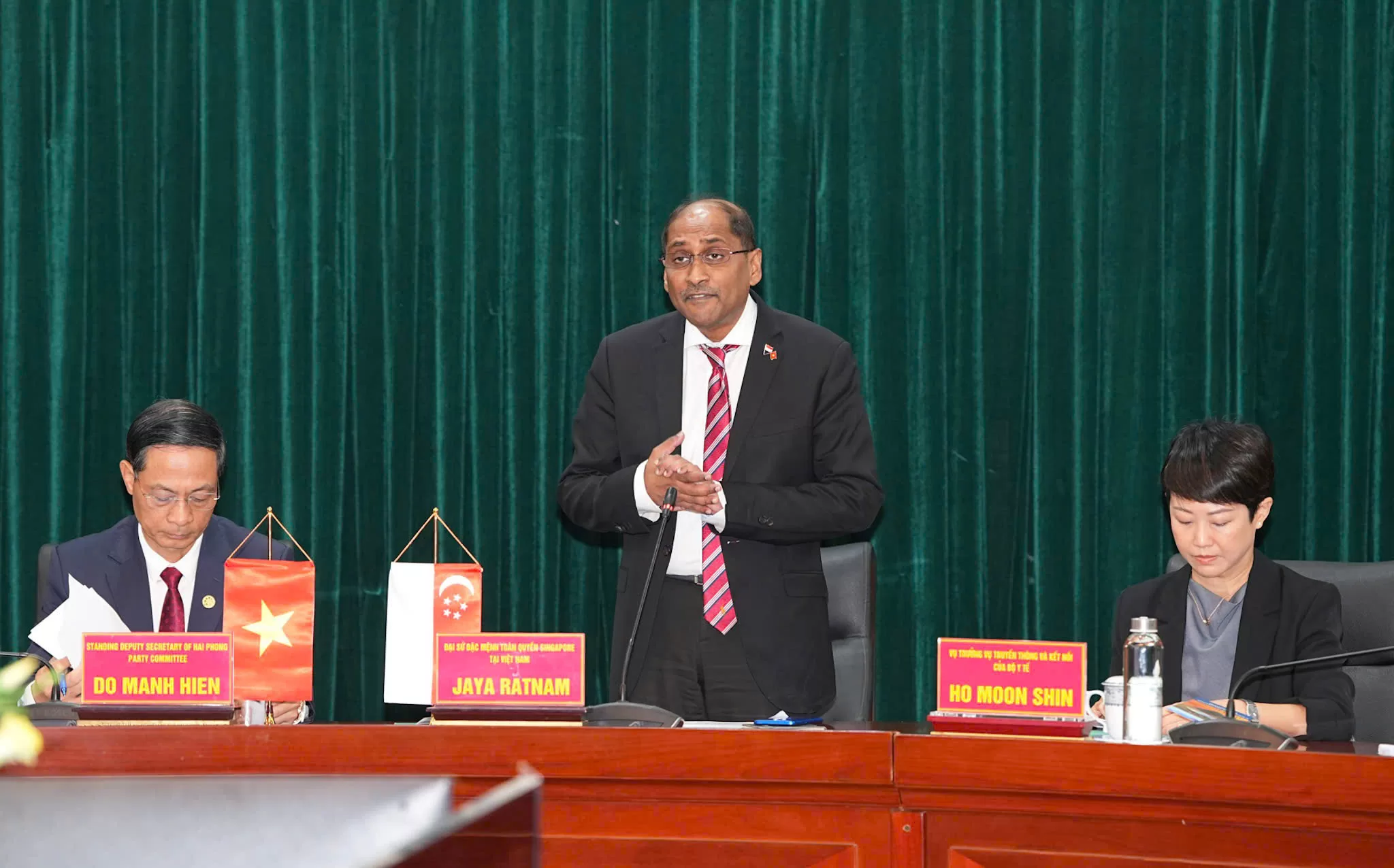 Ngài Jaya Ratnam, Đại sứ đặc mệnh toàn quyền Singapore tại Việt Nam cảm ơn sự đón tiếp trọng thị của lãnh đạo thành phố. Đồng thời đánh giá rất cao định hướng phát triển kinh tế, xã hội của Hải Phòng, đặc biệt là về phát triển cảng nước sâu Lạch Huyện, cùng với đó chia sẻ một số nội dung Singapore có thể hỗ trợ Hải Phòng thời gian tới như xây dựng khu thương mại tự do thế hệ mới, tiếp tục mở rộng phát triển Khu công nghiệp VSIP để thu hút các nhà đầu tư nước ngoài đến với Hải Phòng và một số nội dung khác.