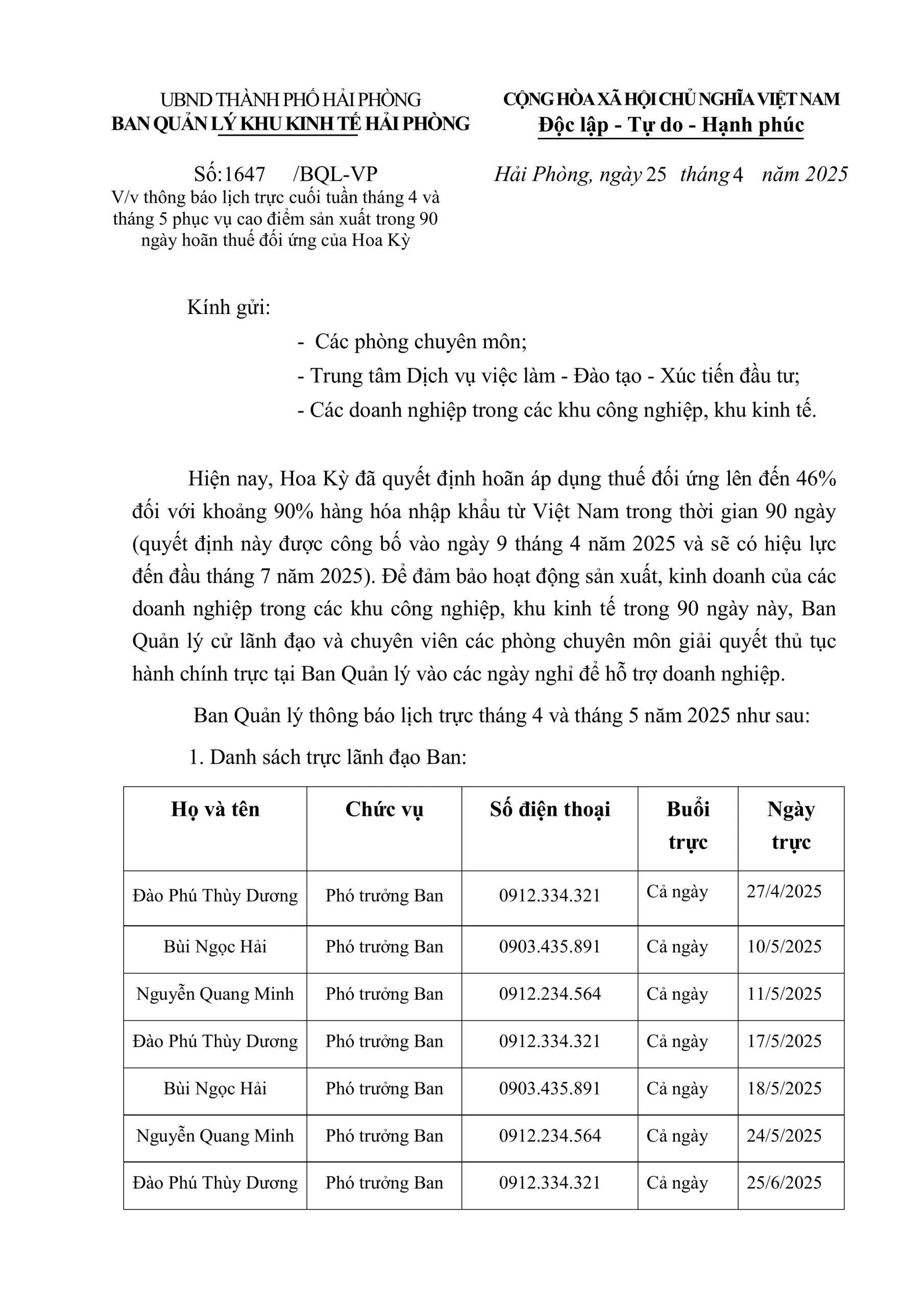 Trong bối cảnh Hoa Kỳ quyết định hoãn áp thuế đối ứng lên đến 46% đối với 90% hàng hóa nhập khẩu từ Việt Nam trong 90 ngày (từ tháng 4 đến đầu tháng 7 năm 2025), Ban Quản lý Khu Kinh tế Hải Phòng đã nhanh chóng vào cuộc, thể hiện tinh thần trách nhiệm và sự đồng hành nhiệt huyết với các doanh nghiệp. Với kế hoạch trực cuối tuần trong suốt tháng 4, tháng 5 và tháng 6 năm 2025, Ban Quản lý đang nỗ lực hết mình để hỗ trợ doanh nghiệp tận dụng tối đa “thời gian vàng” này, đảm bảo nhịp độ sản xuất kinh doanh và thúc đẩy tăng trưởng kinh tế.