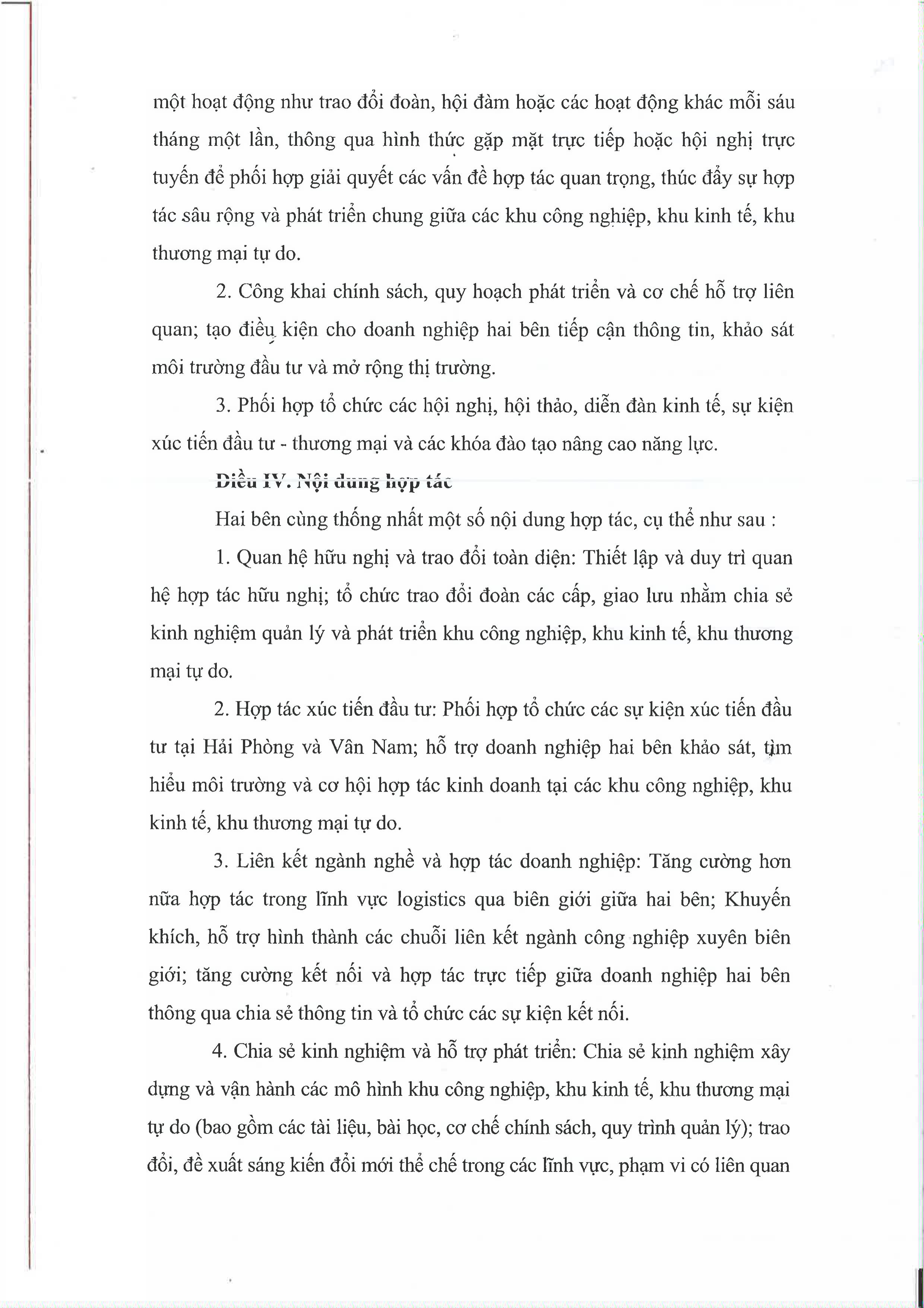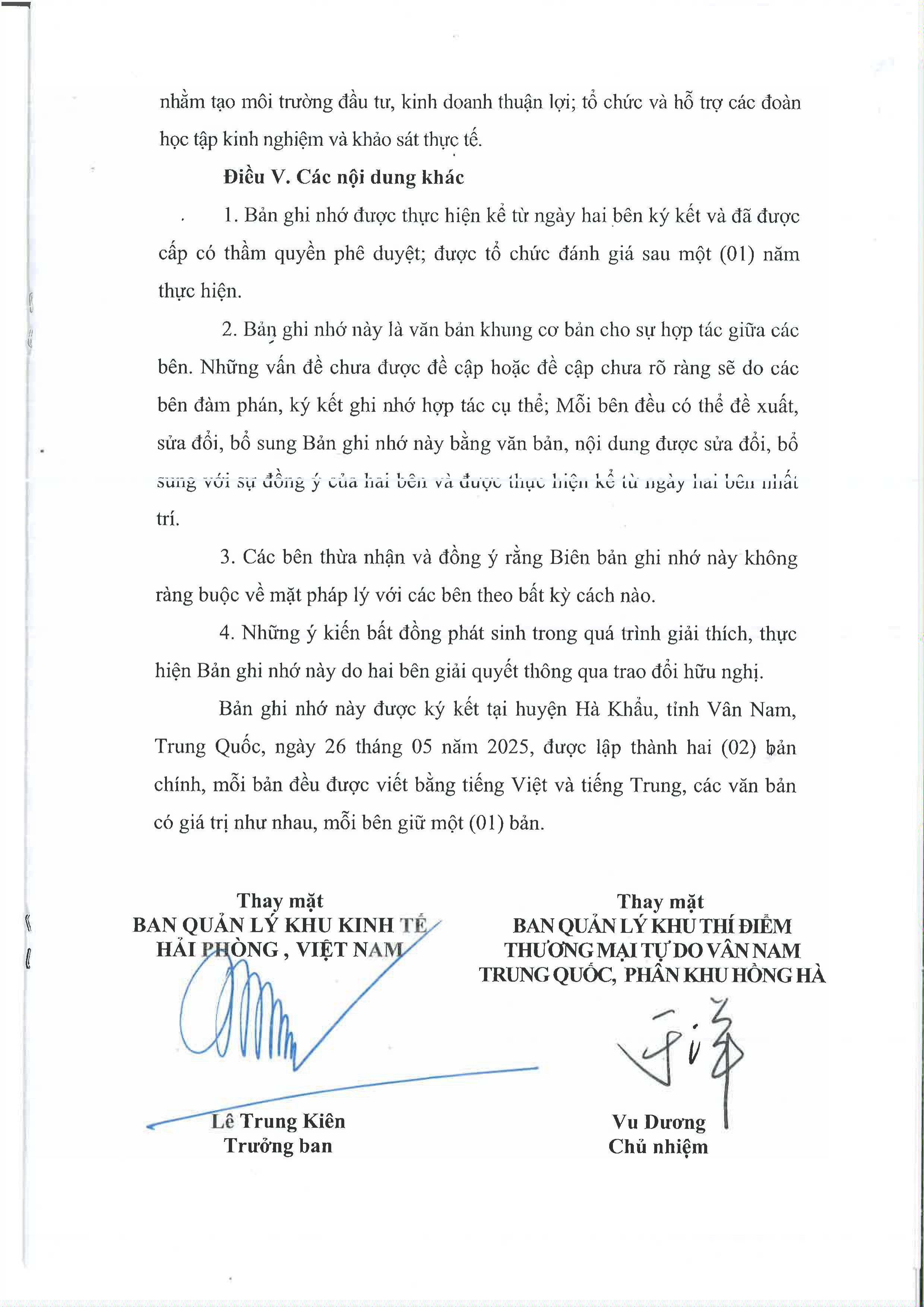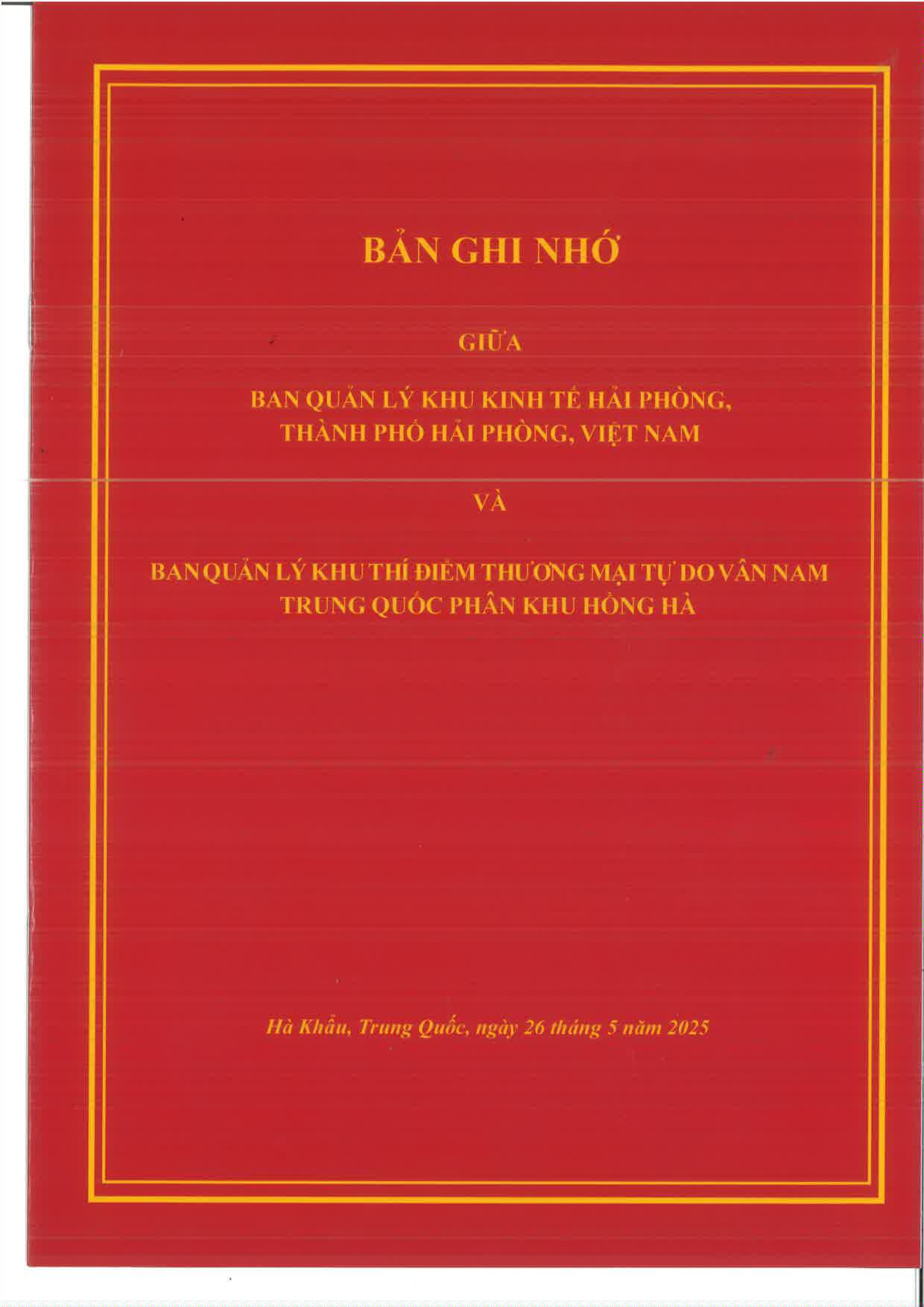 Ngày 26/5/2025, trong khuôn khổ chuyến công tác của Đoàn đại biểu thành phố Hải Phòng tại huyện Hà Khẩu, châu Hồng Hà, tỉnh Vân Nam, Trung Quốc, được sự nhất trí của cấp có thẩm quyền, Ban Quản lý Khu kinh tế Hải Phòng và Ban Quản lý Khu thí điểm thương mại tự do Vân Nam – phân khu Hồng Hà đã ký kết Bản ghi nhớ hợp tác, theo đó hai bên cùng thống nhất một số nội dung hợp tác, cụ thể như sau:
