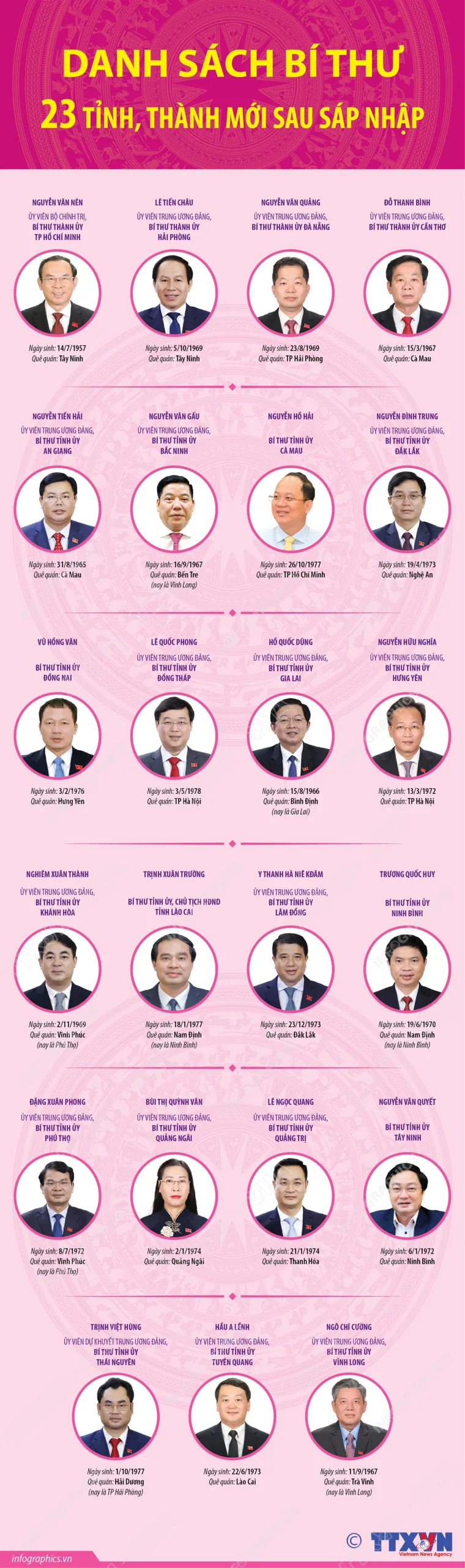 Sáng 30/6/2025, Lễ công bố các nghị quyết, quyết định của Trung ương và địa phương về sáp nhập đơn vị hành chính, thành lập tổ chức đảng, chỉ định cấp uỷ, Hội đồng nhân dân, Ủy ban nhân dân, Ủy ban Mặt trận Tổ quốc Việt Nam tỉnh, thành phố, xã, phường, đặc khu được thực hiện đồng bộ trên toàn quốc. Sau đây là danh sách 23 Bí thư các tỉnh, thành phố mới sau sáp nhập.