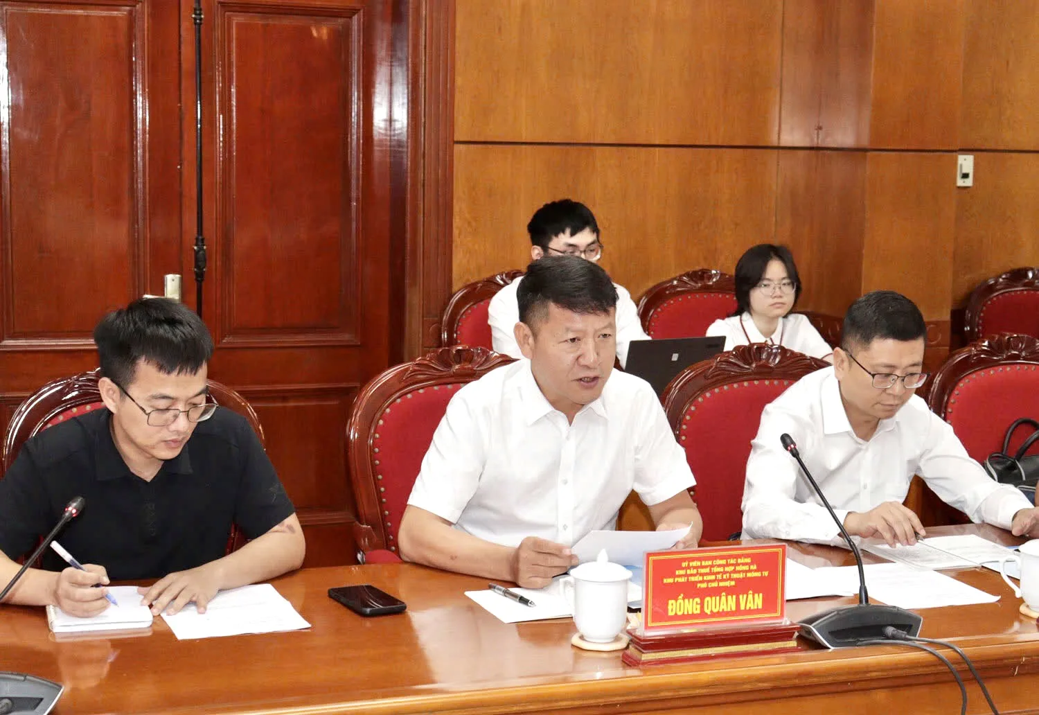 Đồng chí Đồng Quân Vân, Phó Chủ nhiệm Khu bảo thuế tổng hợp Hồng Hà, Khu phát triển kinh tế kỹ thuật Mông Tự phát biểu tại cuộc làm việc.