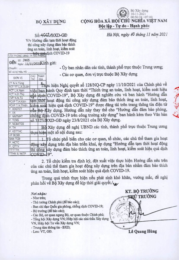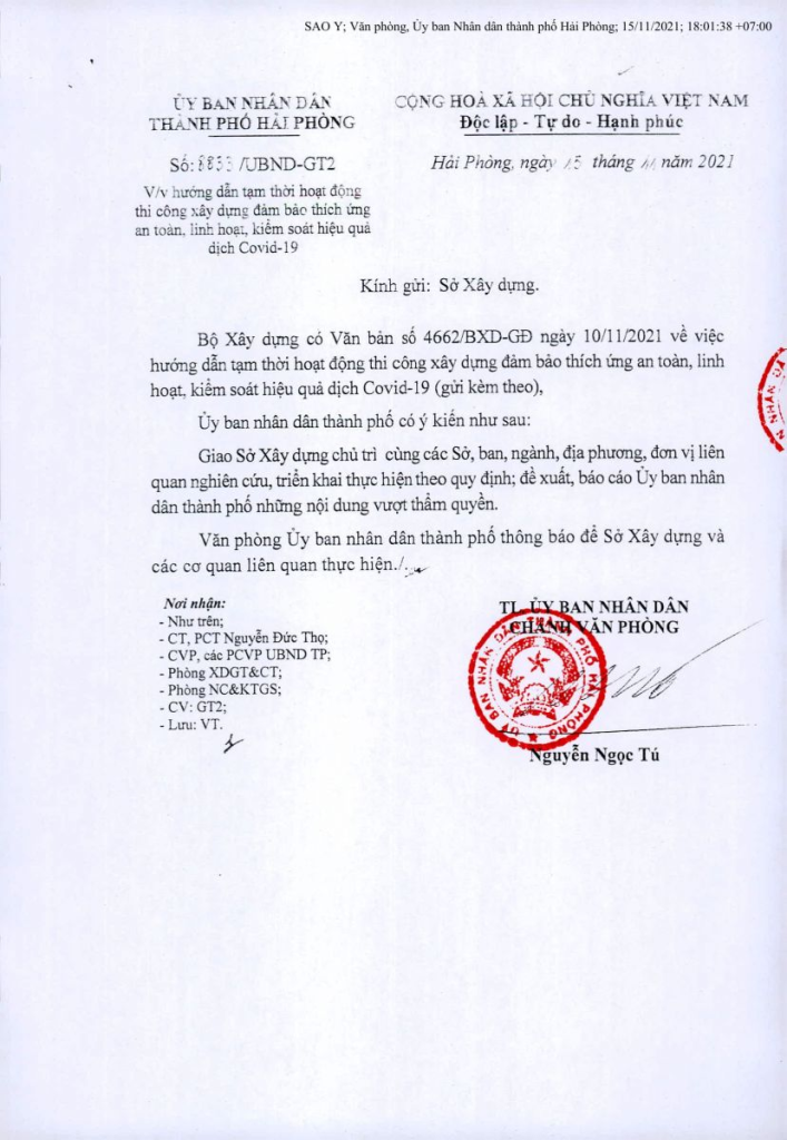 Ngày 15/11/2021, UBND thành phố Hải Phòng ban hành Công văn số 8833/UBND-GT2 về việc hướng dẫn tạm thời thi công xây dựng đảm bảo thích ứng an toàn,linh hoạt, kiểm soát hiệu quả dịch Covid – 19.