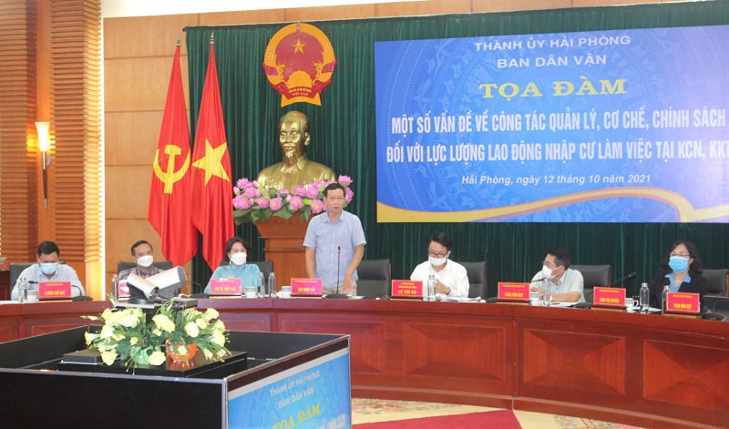 Hướng tới kỷ niệm 91 năm Ngày truyền thống công tác Dân vận của Đảng (15/10/1930 – 15/10/2021). Sáng 12/10, Ban Dân vận Thành ủy tổ chức Toạ đàm “Một số vấn đề về công tác quản lý, cơ chế, chính sách đối với lực lượng lao động nhập cư, làm việc tại khu công nghiệp, khu kinh tế Hải Phòng”. Đồng chí Lê Trí Vũ, Ủy viên Ban Thường vụ Thành ủy, Trưởng Ban Dân vận Thành ủy, Phó Trưởng Ban Thường trực Ban Chỉ đạo Xây dựng giai cấp công nhân Hải Phòng chủ trì Hội nghị. Dự Hội nghị có đại diện lãnh đạo các ban, ngành, địa phương, đơn vị và doanh nghiệp.