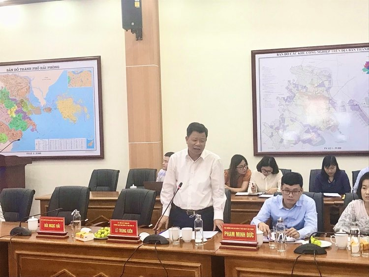 Ông Lê Trung Kiên, Uỷ viên Ban Thường vụ Thành ủy, Trưởng ban Ban Quản lý Khu kinh tế Hải Phòng phát biểu tại hội nghị