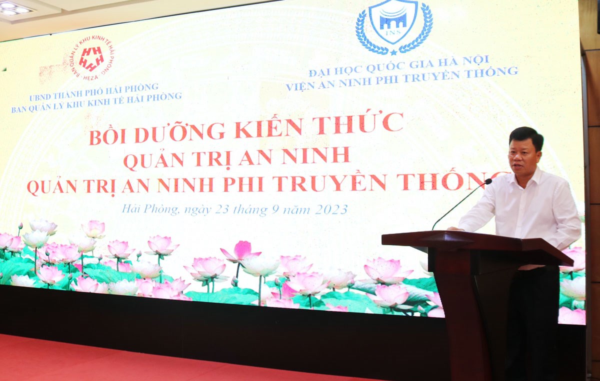 Phát biểu tại hội nghị, đồng chí Lê Trung Kiên, Trưởng Ban Quản lý Khu kinh tế Hải Phòng nêu rõ: Kinh tế, an ninh kinh tế và quản trị an ninh kinh tế luôn là nội dung quan trọng của mọi quốc gia. Điều này hoàn toàn đúng với kinh tế Việt Nam khi tốc độ tăng trưởng kinh tế luôn ở mức cao và hội nhập quốc tế đang diễn ra mạnh mẽ, là xu thế không thể đảo ngược. Thông qua buổi bồi dưỡng kiến thức về các chuyên đề Quản trị an ninh và Quản trị an ninh phi truyền thống sẽ giúp tăng cường kiến thức, sự hiểu biết trong bối cảnh những vấn đề an ninh mới đang trở thành mối nguy cơ trực tiếp, thường xuyên tới an ninh quốc gia, an ninh cộng đồng, an ninh doanh nghiệp của Việt Nam, phù hợp với Nghị quyết Hội nghị lần thứ VIII Ban Chấp hành Trung ương Đảng khóa XI về chiến lược bảo vệ Tổ quốc trong tình hình mới.