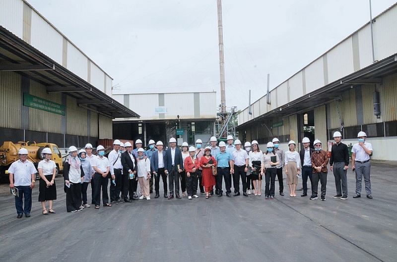 Đoàn công tác chụp ảnh lưu niệm tại nhà máy xử lý chất thải của Công ty Tân Thuận Phong, doanh nghiệp hoạt động cộng sinh công nghiệp trong KCN Nam Cầu Kiền