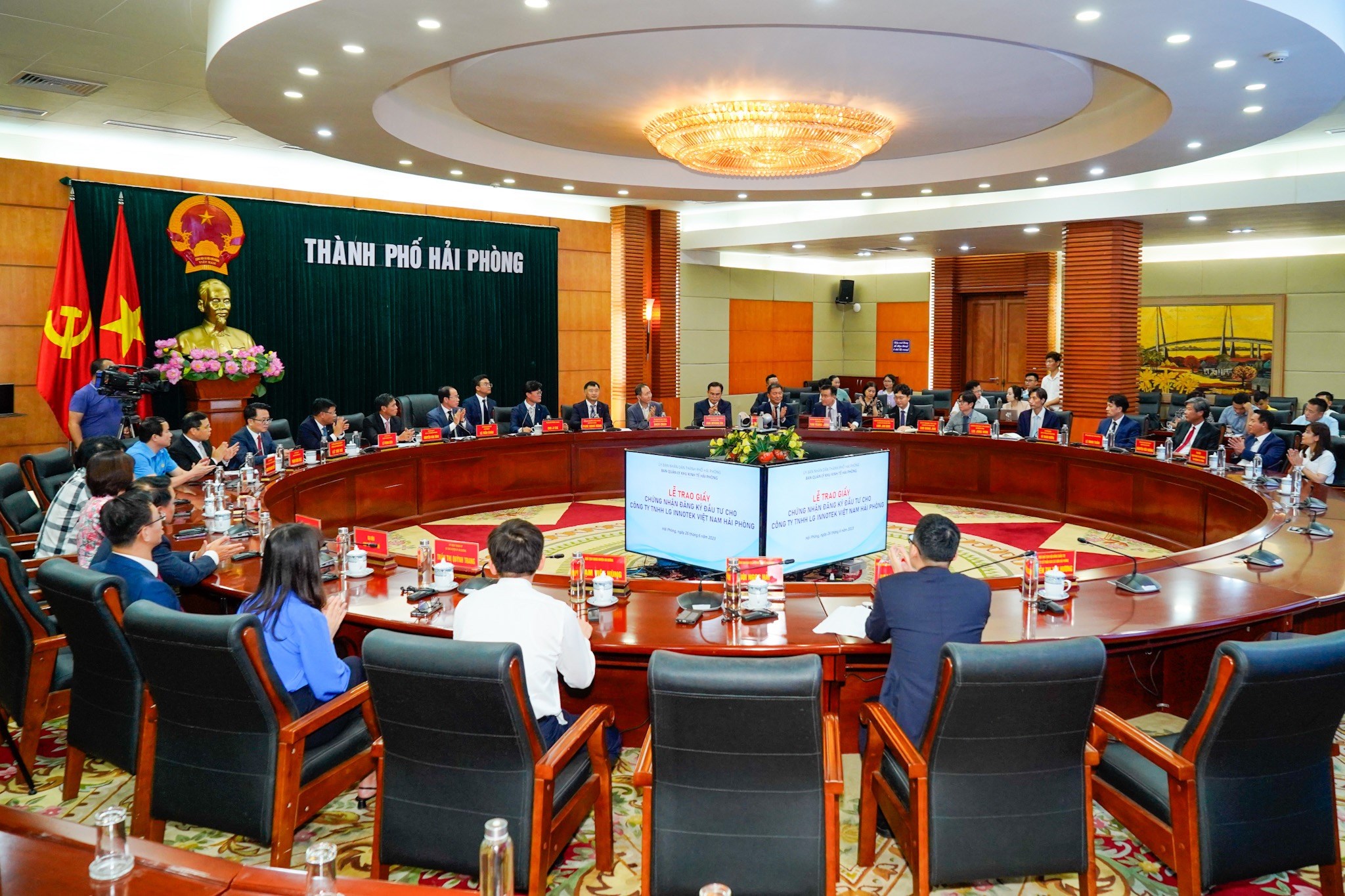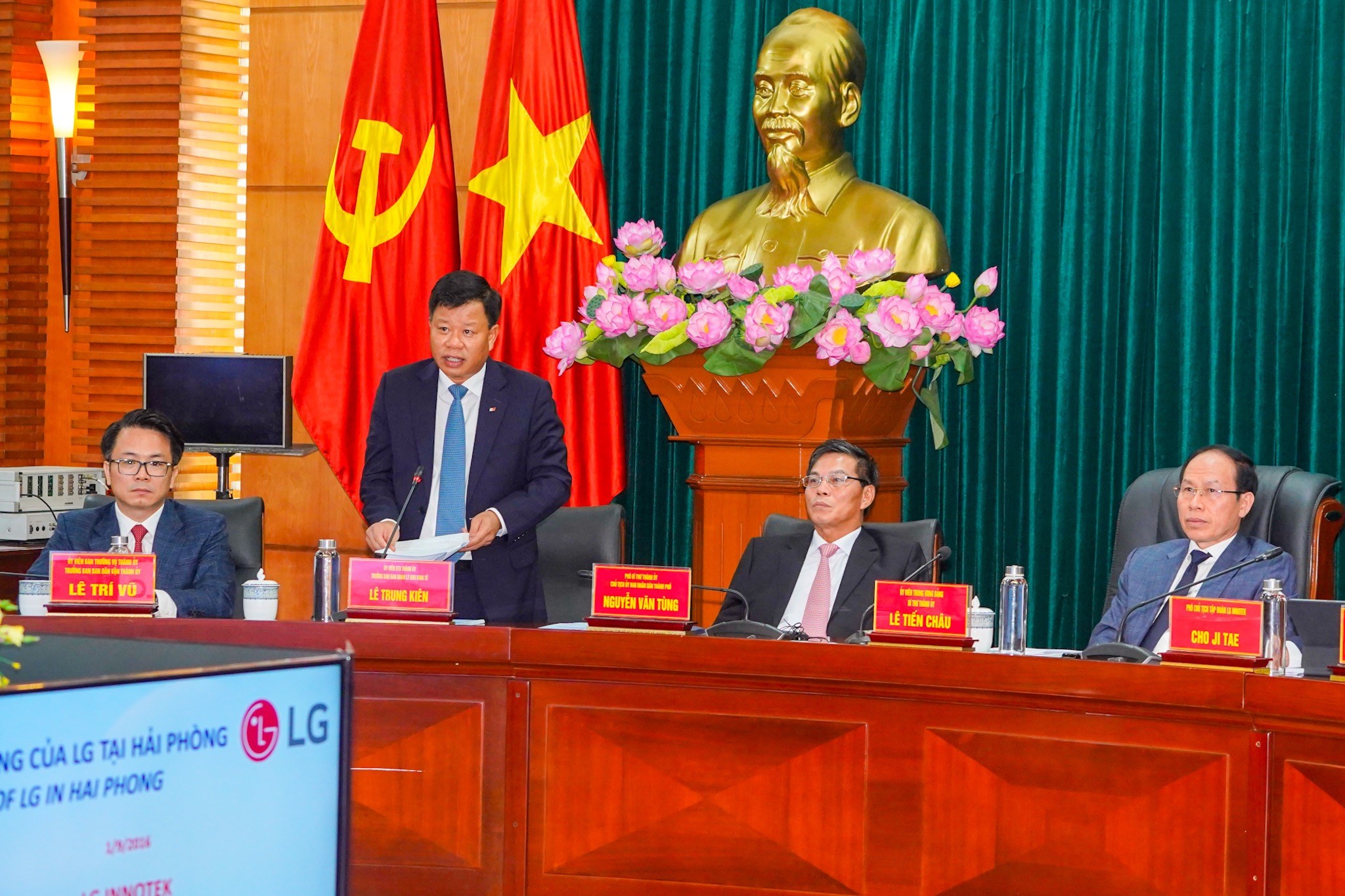 Thay mặt lãnh đạo thành phố, đồng chí Bí thư Thành ủy trân trọng cảm ơn sự quan tâm, tin tưởng của các nhà đầu tư nước ngoài nói riêng và Tập đoàn LG, LG Innotek nói riêng đối với thành phố Hải Phòng. Đồng thời cam kết, các nhà đầu tư sẽ có được sự hỗ trợ, sự giúp đỡ cao nhất của lãnh đạo thành phố, bảo đảm một môi trường đầu tư an toàn, an ninh, đôi bên cùng có lợi, với phương châm: “Sự thành công của doanh nghiệp, chính là sự thành công của thành phố Hải Phòng”.