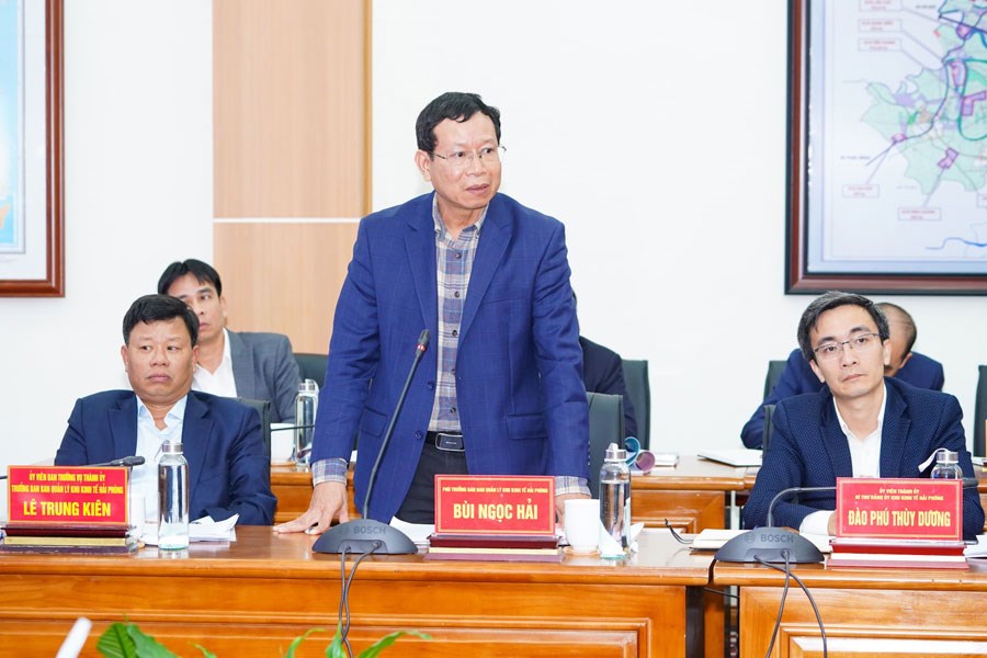 Trình bày báo cáo tại buổi làm việc, đồng chí Lê Trung Kiên – Trưởng ban Ban Quản lý Khu kinh tế Hải Phòng điểm lại quá trình 30 năm xây dựng và phát triển, từ chỉ quản lý 1 khu chế xuất và 2 khu công nghiệp (KCN), trên địa bàn thành phố hiện có 1 khu kinh tế (KKT) Đình Vũ – Cát Hải (diện tích 22.540 ha) và 25 khu công nghiệp được quy hoạch (tổng diện tích 12.702 ha). Trong đó, hiện có 14 KCN đang triển khai hoạt động đầu tư, xây dựng, kinh doanh cơ sở hạ tầng với tổng diện tích 6.131,36 ha (9 KCN  nằm trong Khu kinh tế Đình Vũ – Cát Hải và 5 KCN nằm ngoài KKT); tỷ lệ lấp đầy trung bình khoảng 65% (nếu không tính phần diện tích các KCN đang triển khai, chưa thu hút đầu tư tỷ lệ lấp đầy đạt tỷ lệ 94%); có 2 KCN sinh thái đang được chuyển đổi và nỗ lực xây dựng thành KCN sinh thái toàn diện, hiệu quả, bền vững.