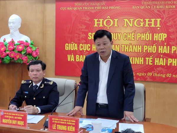 Sáng 9/2/2023, Cục Hải quan Hải quan Hải Phòng và Ban Quản lý Khu Kinh tế Hải Phòng sơ kết thực hiện quy chế phối hợp. Các đồng chí: Lê Trung Kiên – Uỷ viên Ban Thường vụ Thành uỷ – Trưởng ban Ban Quản lý Khu Kinh tế Hải Phòng; Nguyễn Duy Ngọc – Cục trưởng Cục Hải quan Hải Phòng chủ trì.