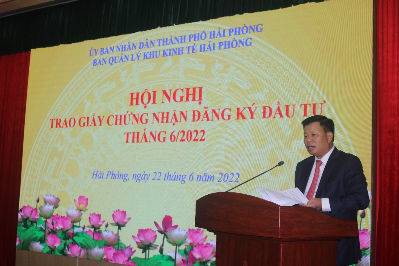 Lãnh đạo Ban Quản lý Khu kinh tế Hải Phòng cũng đồng thời trao Giấy chứng nhận đăng ký đầu tư mới cho 3 dự án (Dự án sản xuất chế tạo bộ phận linh kiện hệ thống an toàn thụ động ô tô HMT Hải Phòng của Công ty TNHH Công nghệ vật liệu mới HMT, Dự án phát triển Nam Đình Vũ CN3-03 của nhà đầu tư ESR V Investor 4 Pte.Ltd, Dự án Trung tâm công nghiệp GNP Nam Đình Vũ của Công ty TNHH Classic Leaf Việt Nam) và 2 dự án tăng vốn (Dự án “Sản xuất thiết bị điện, điện tử PhiHong Việt Nam” của Công ty TNHH PhiHong Việt Nam tại KCN An Dương và Dự án “Sản xuất nam châm” của Công ty TNHH Vật liệu nam châm Shin-Etsu Việt Nam tại KCN Đình Vũ).