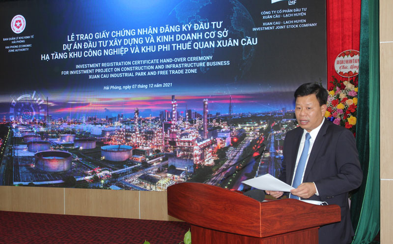 Ngày 07/12/2021, Ban Quản lý Khu kinh tế Hải Phòng tổ chức buổi Lễ trao Giấy chứng nhận đăng ký đầu tư Dự án đầu tư xây dựng và kinh doanh cơ sở hạ tầng khu công nghiệp và Khu Phi thuế quan Xuân Cầu do Công ty CP Đầu tư Xuân Cầu – Lạch Huyện làm chủ đầu tư. Đồng chí Lê Trung Kiên, Ủy viên Ban Thường vụ Thành ủy, Trưởng Ban Quản lý Khu Kinh tế Hải Phòng chủ trì buổi Lễ.