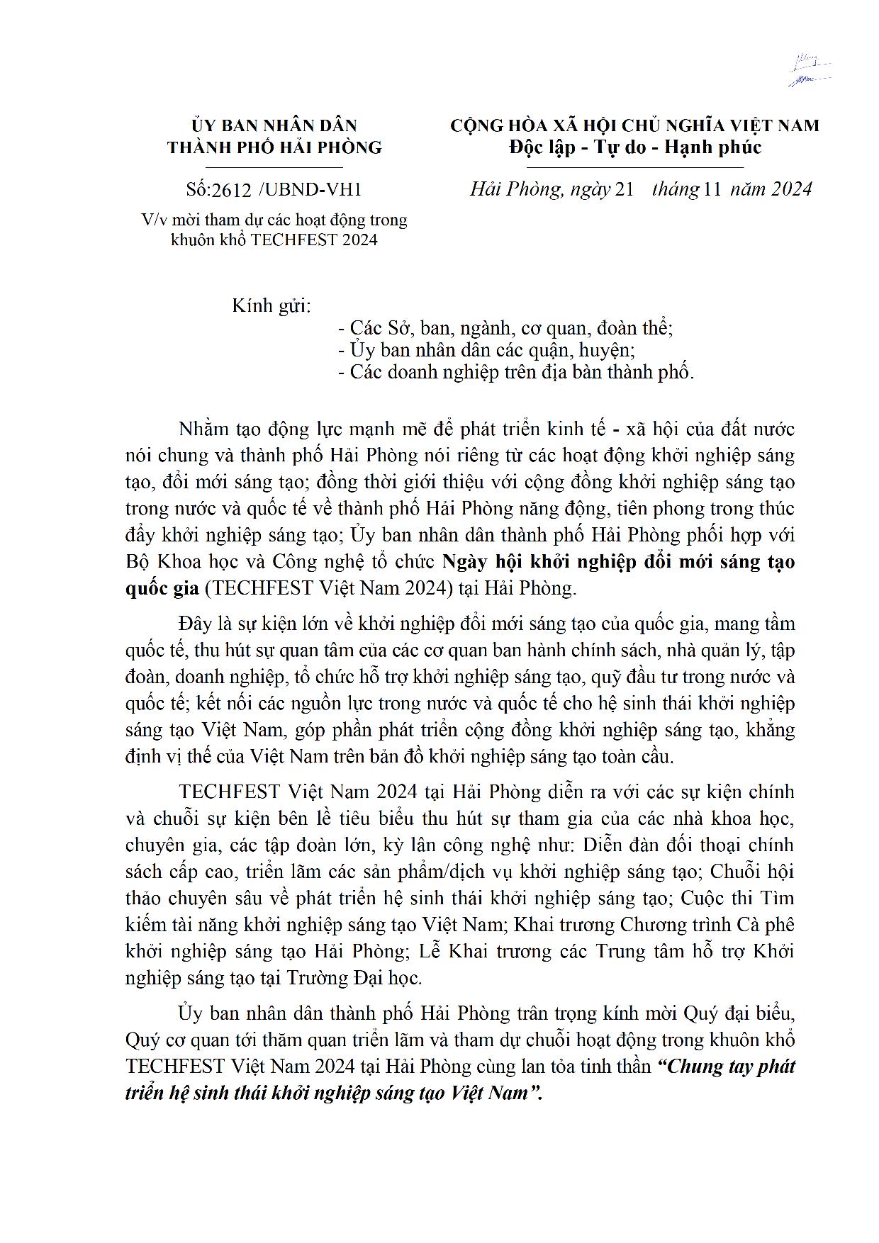 Công văn Số: 2612/UBND-VH1 V/v mời tham dự các hoạt động trong khuôn khổ TECHFEST 2024